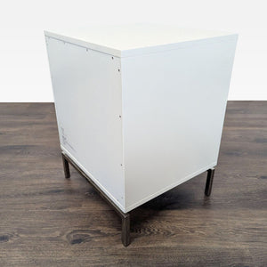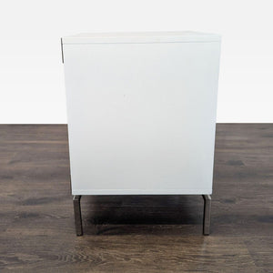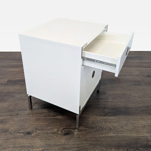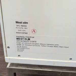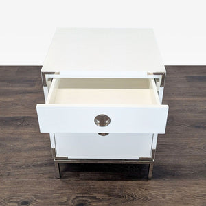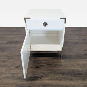 Inspired by furniture designed for 18th-century European explorers, the Malone Campaign Nightstand’s polished nickel hardware references the gilded corners on British empire-era travel chests. The finish is white lacquer.