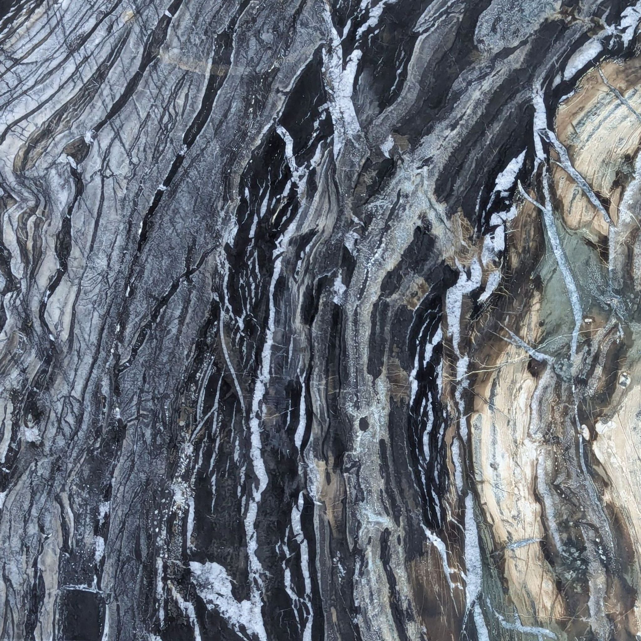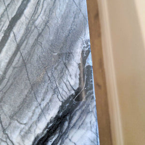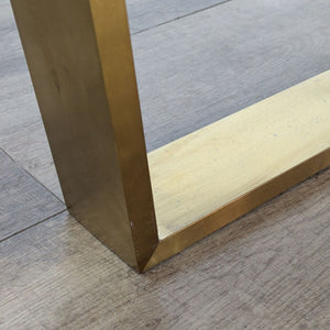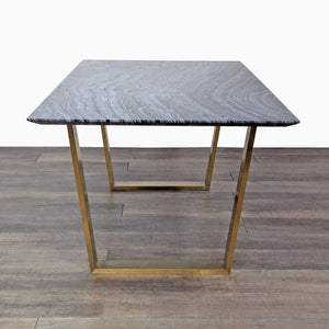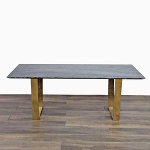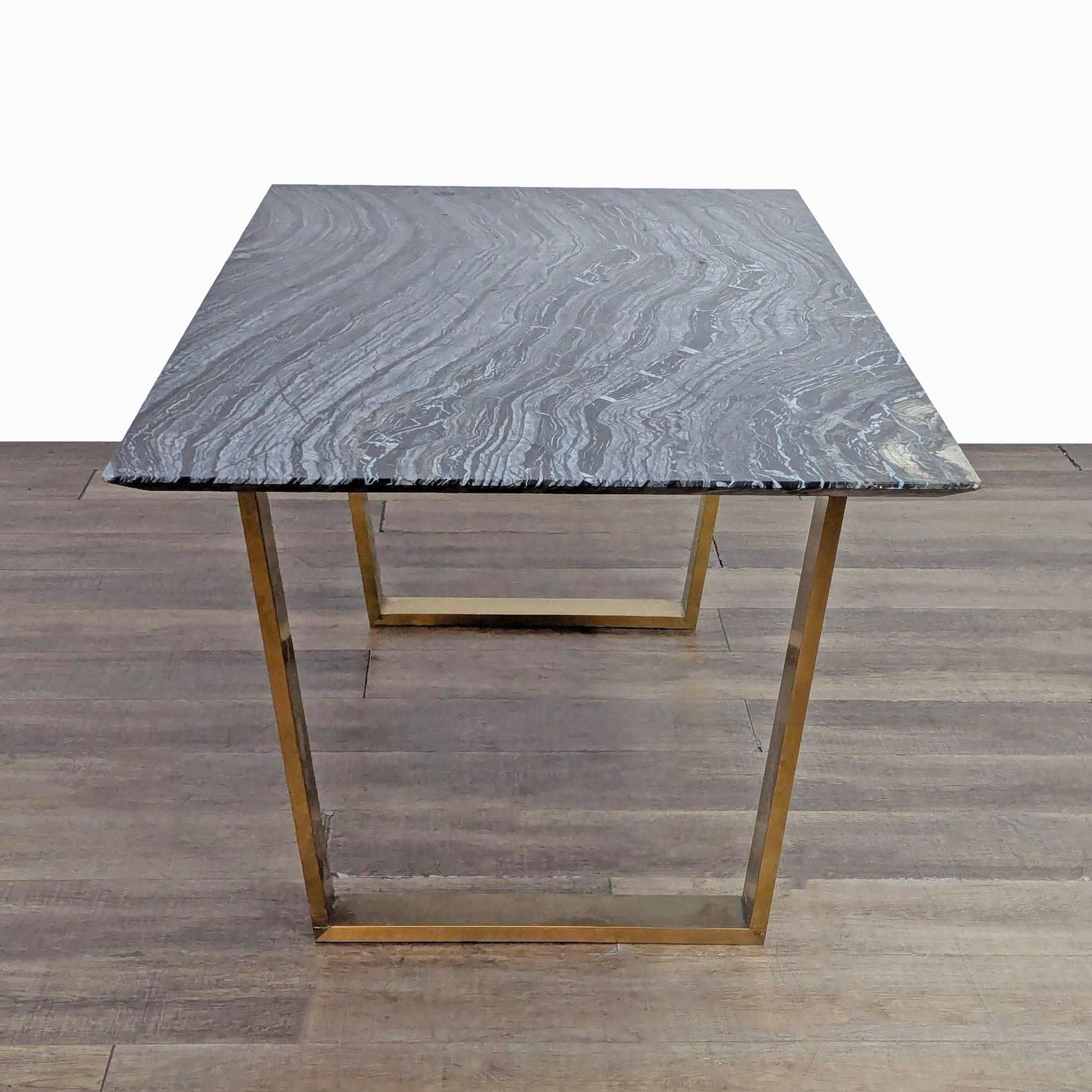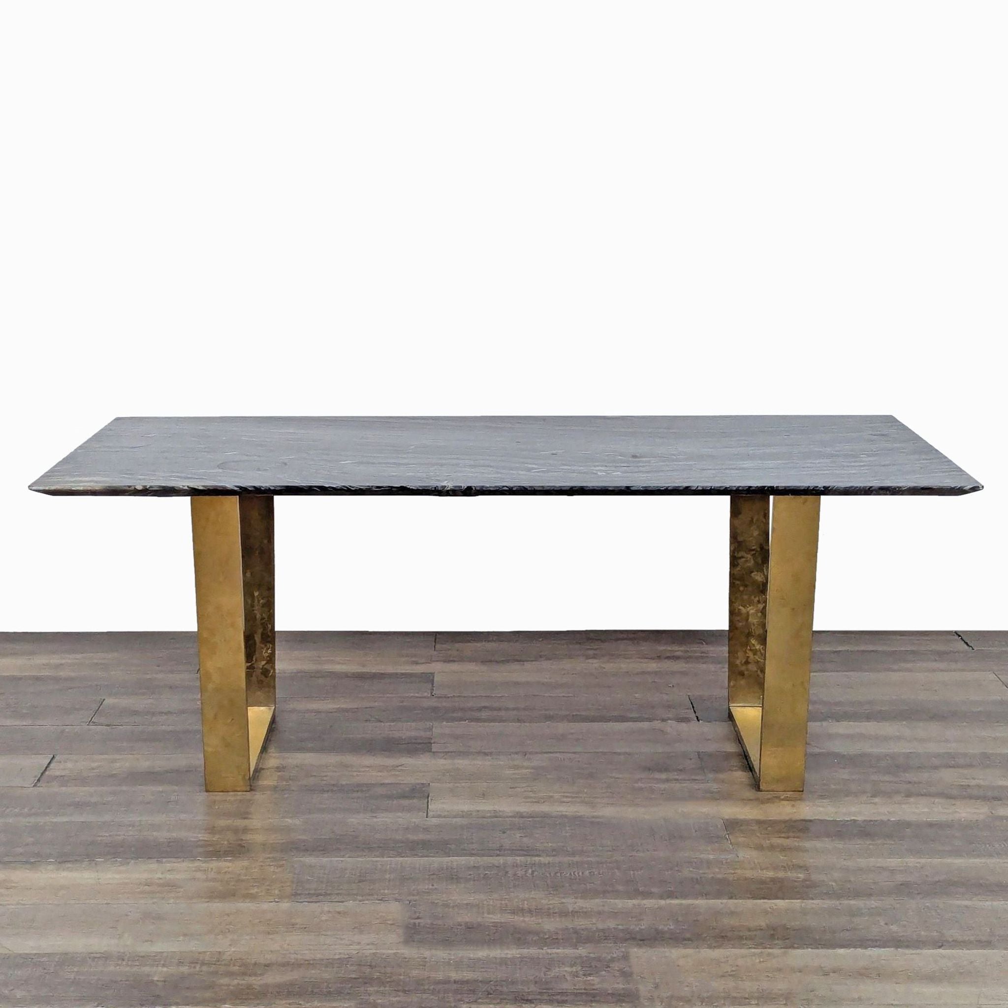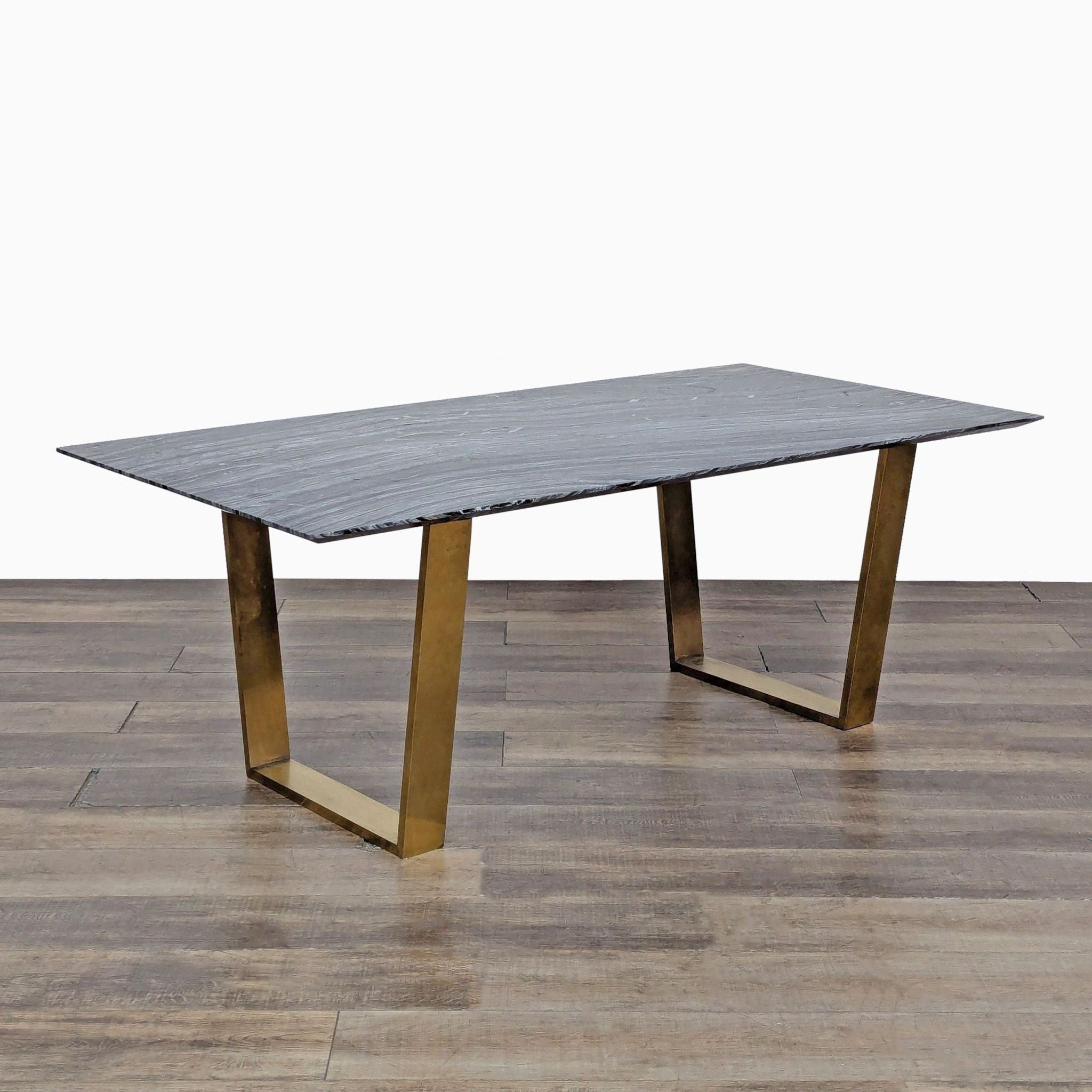 Black Wood Vein marble top on steel sled legs in a brushed gold finish