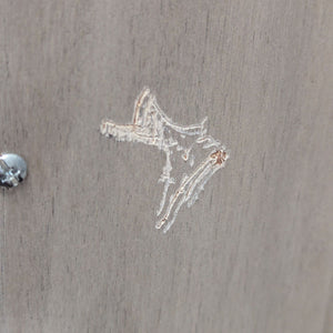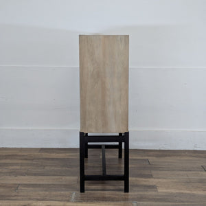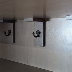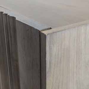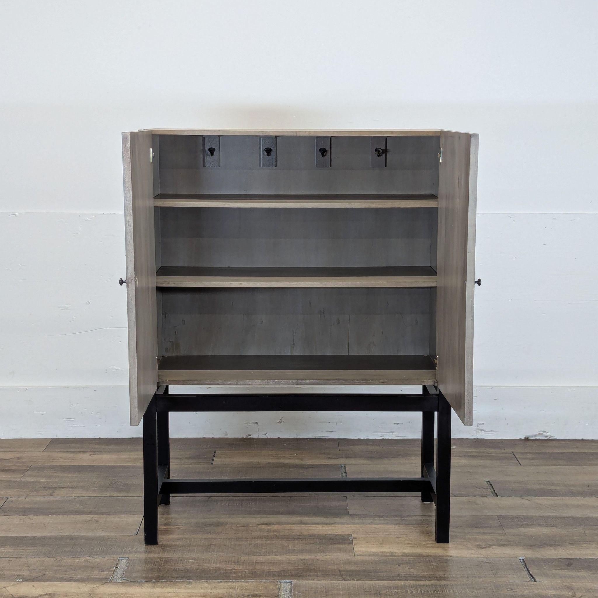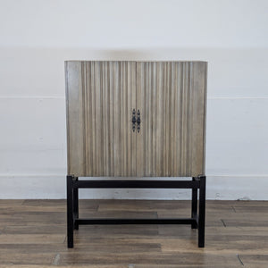 Ribbed wood doors with interior shelving and hooks on metal frame. Sourced by Jeff Schlarb's Group.