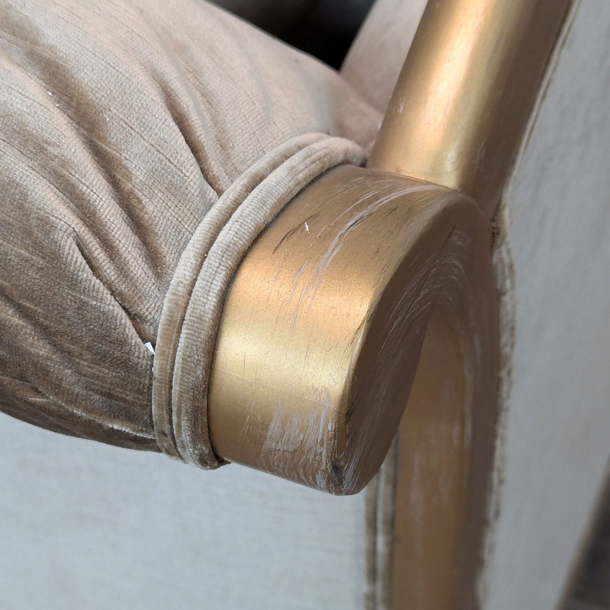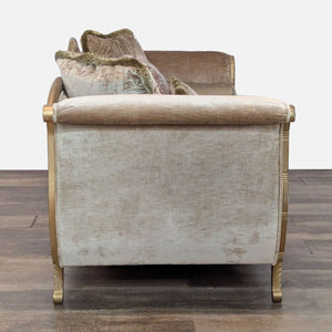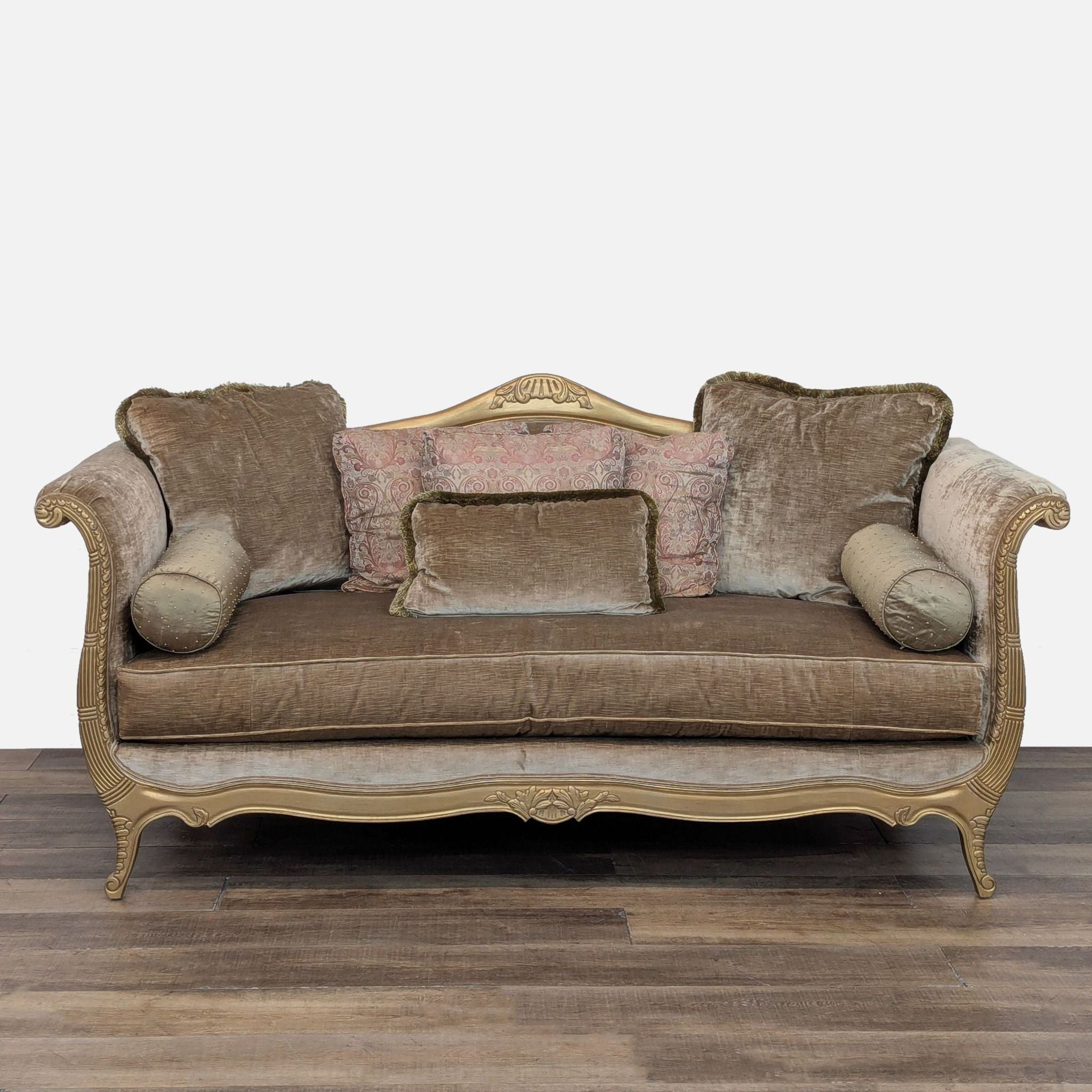 Features wood frame with carved detailing, velvet upholstery and decorative accent pillows.