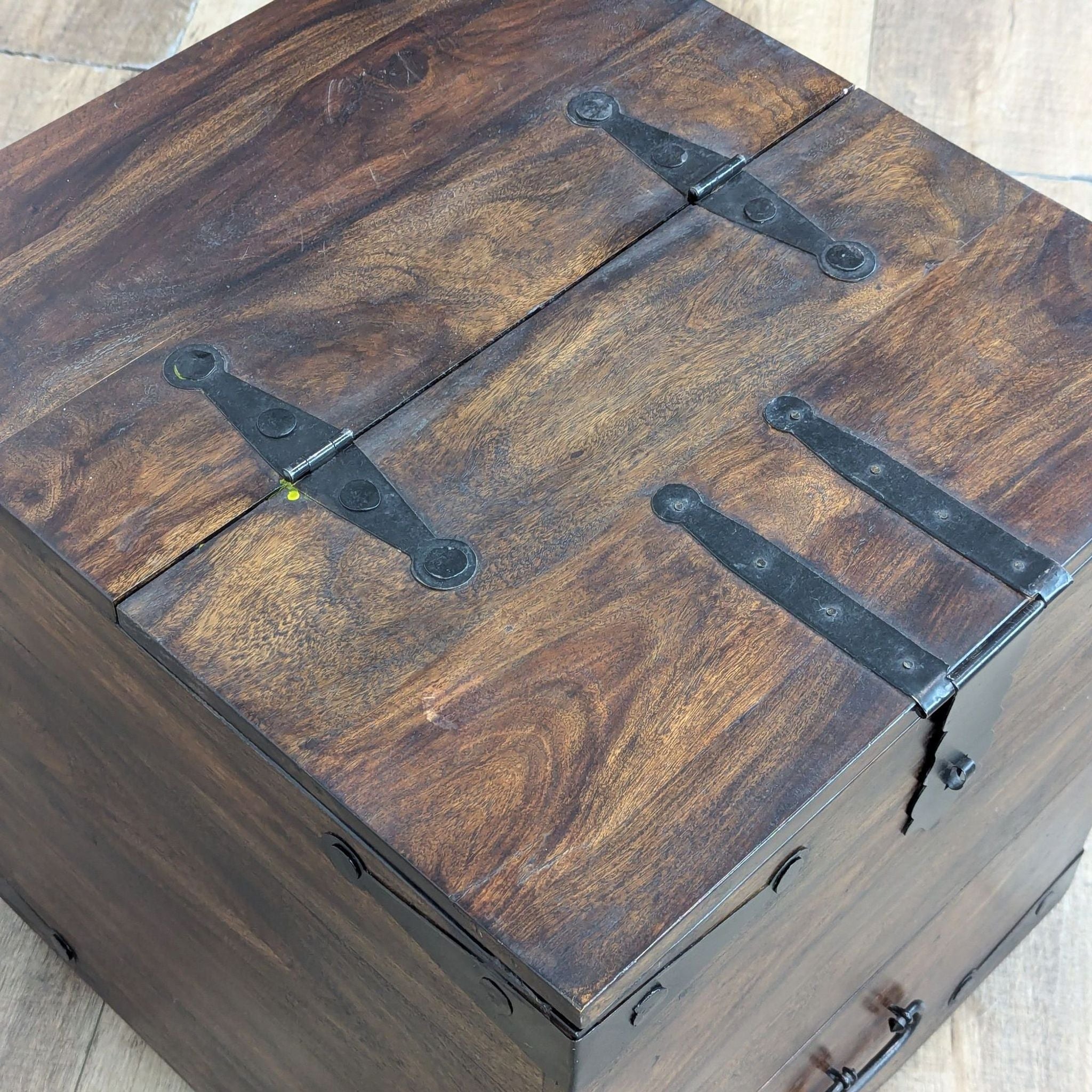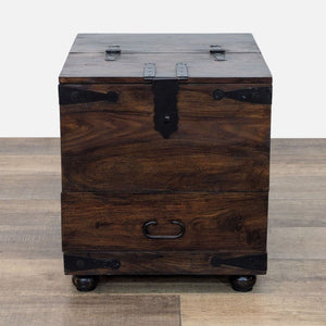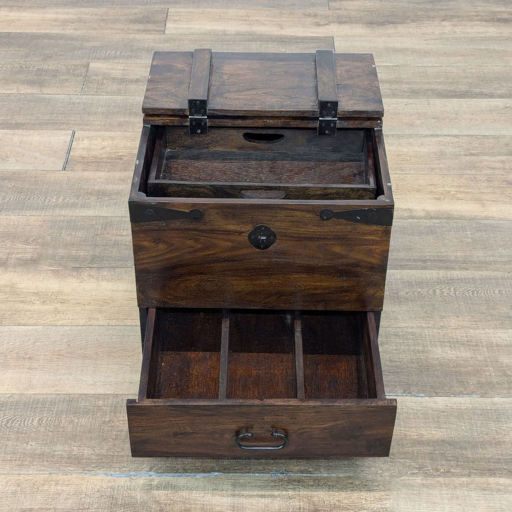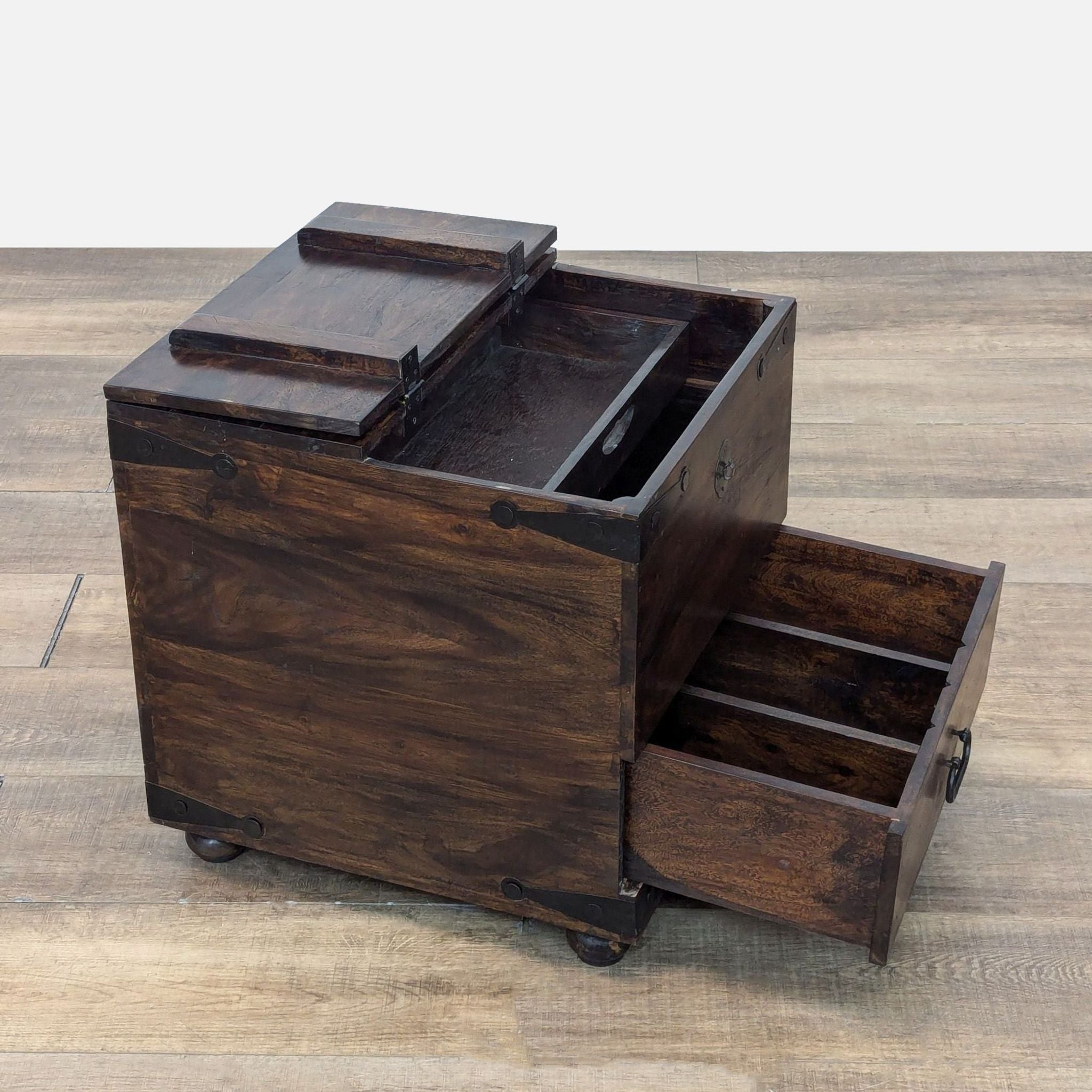 Flip-Top with tray and additional storage, one divided drawer, and metal embellishments.