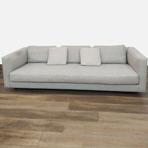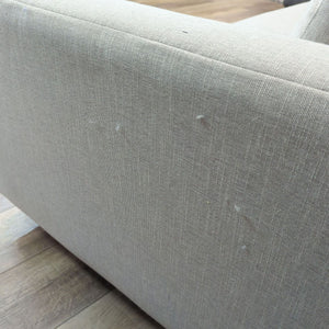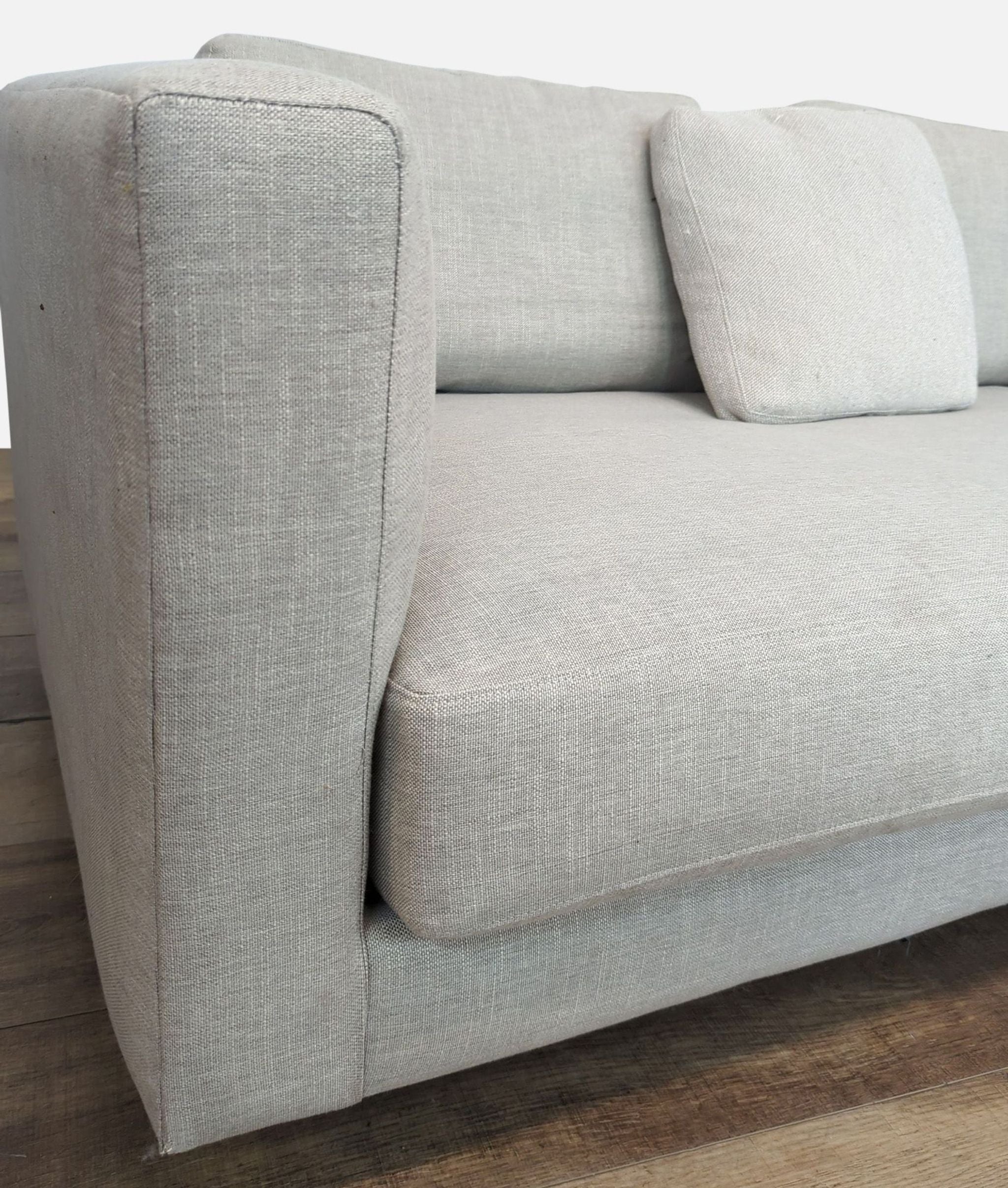 The Hands Down sofa has a single bench cushion, track arms and upholstered in Landa Stone fabric.