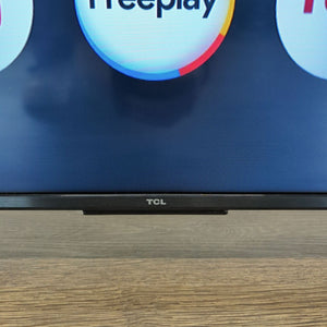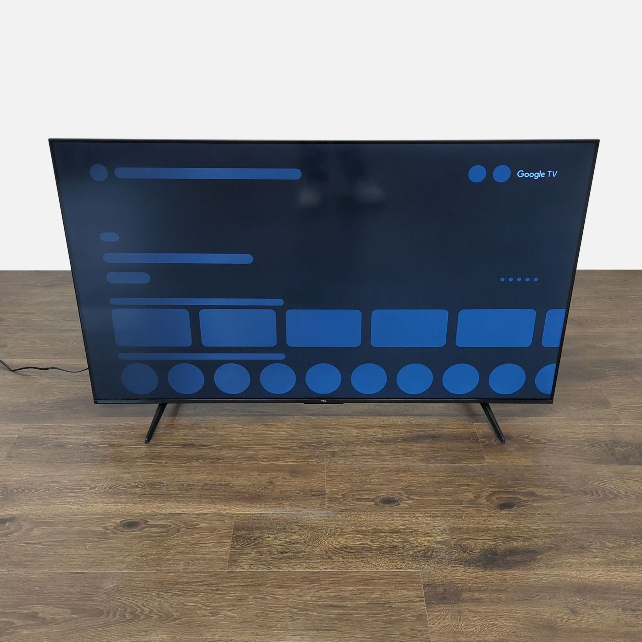 This TCL TV features a large, clear screen and a sleek, modern frame. It runs on Google TV, giving you access to apps like Netflix, Prime Video, Disney+, and YouTube. The TV stands firmly on two legs and has easy-to-use smart features, perfect for streaming your favorite shows and movies. Great choice for any room.