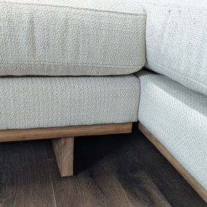 This stylish sectional features a light beige fabric and a spacious chaise, perfect for relaxing or entertaining guests. The clean lines and wooden base give it a modern look that fits any living room. Comfortable cushions provide plenty of support for everyday use. Great for family rooms or apartments.