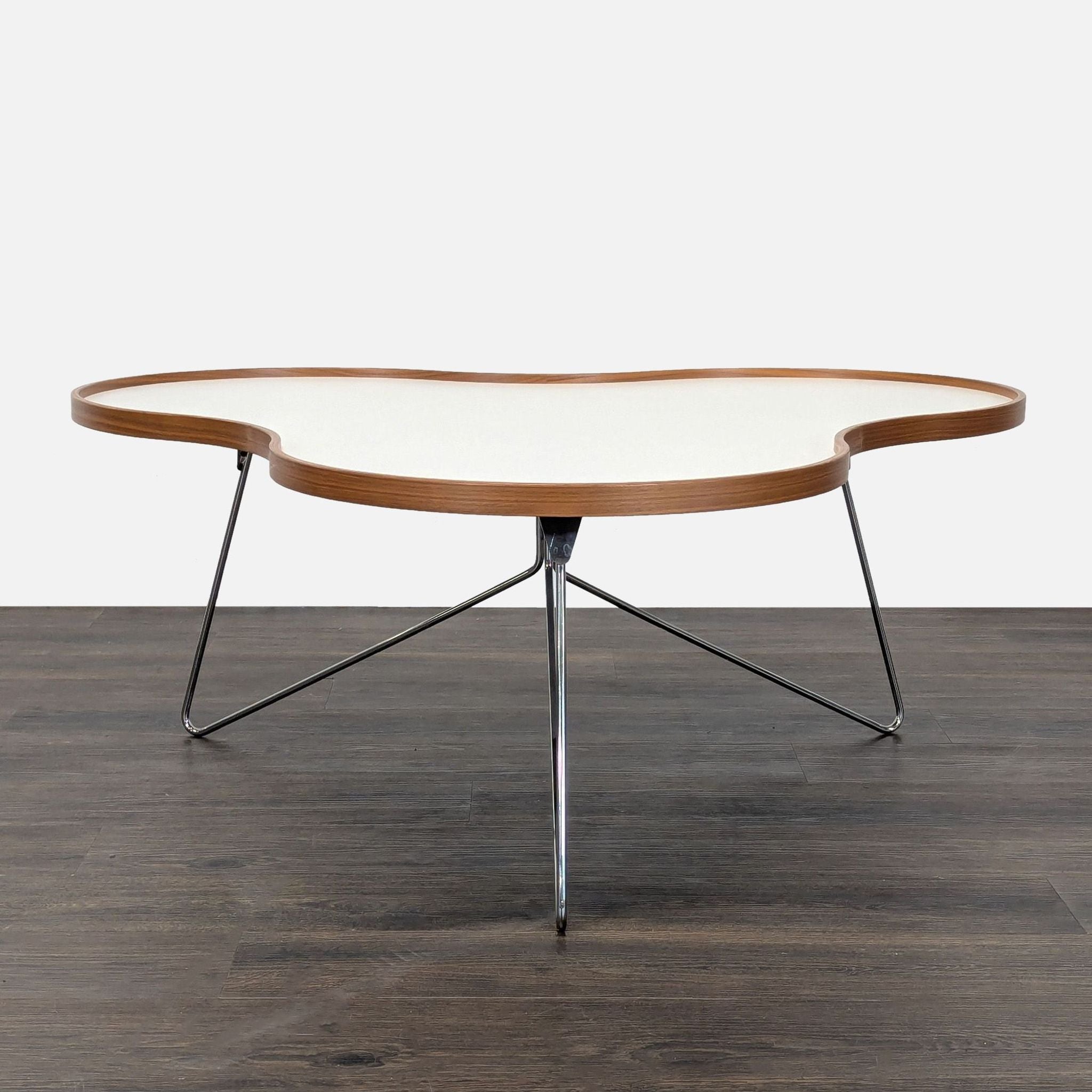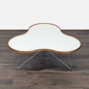 Designed by Christine Schwarzer with an organic shape and stem-like structure. The top is laminate and wood. The base is chrome.