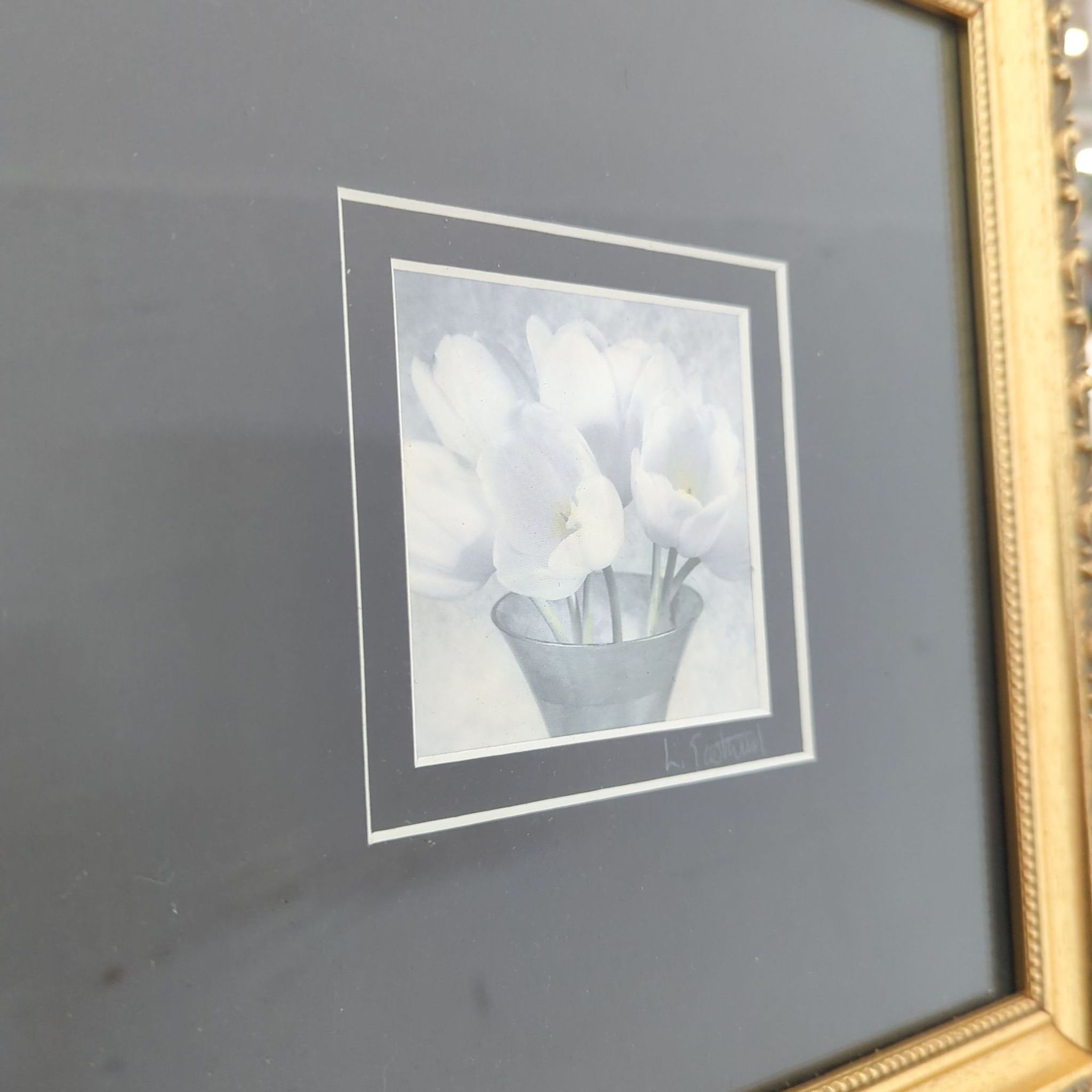 This is a beautiful floral print by L. Eastwood, featuring delicate white flowers in a vase. The artwork is set in a stylish black mat and surrounded by an ornate gold frame. Perfect for adding a touch of elegance to your home or office. Ready to hang and display.