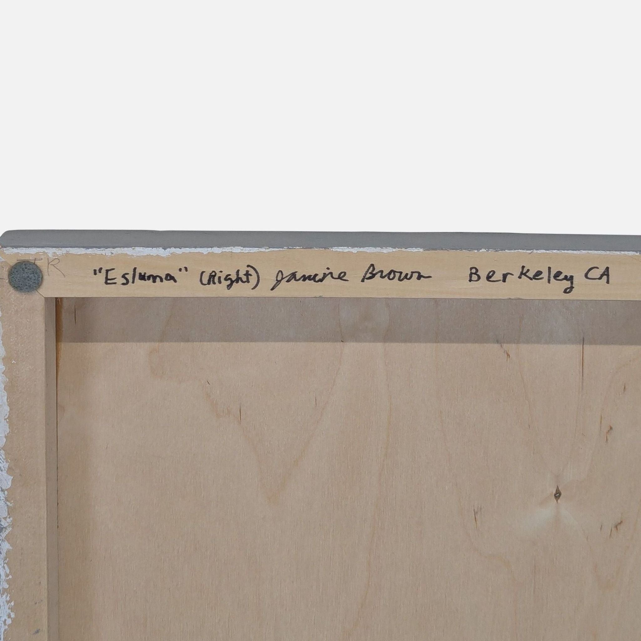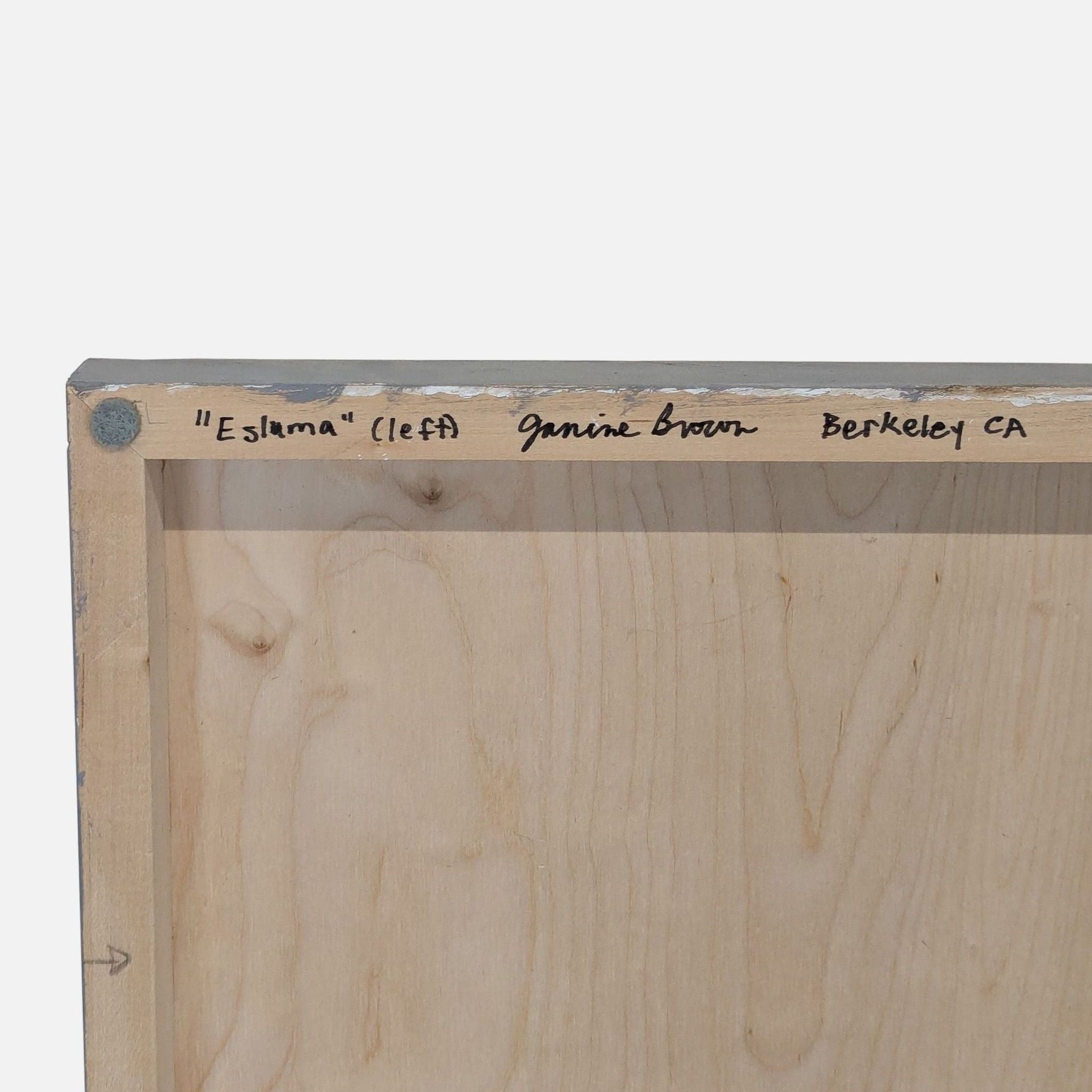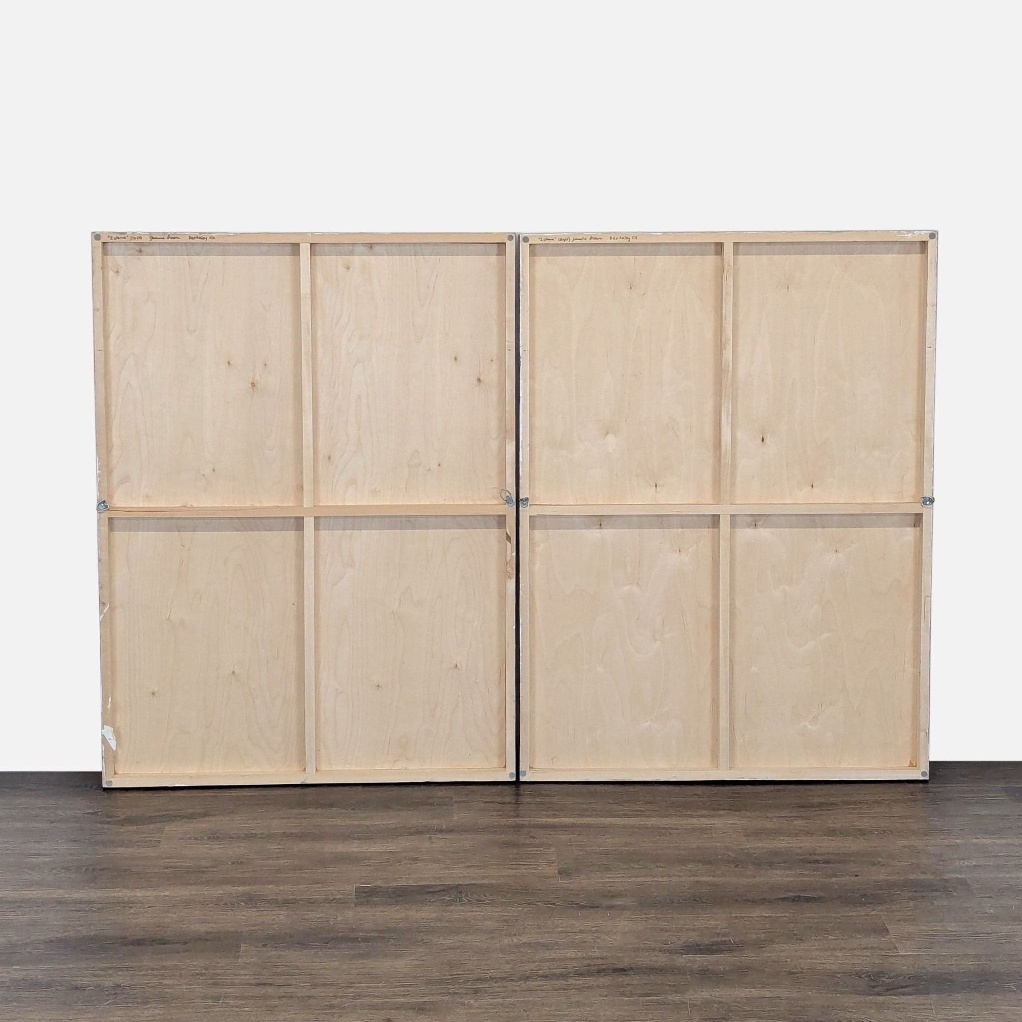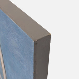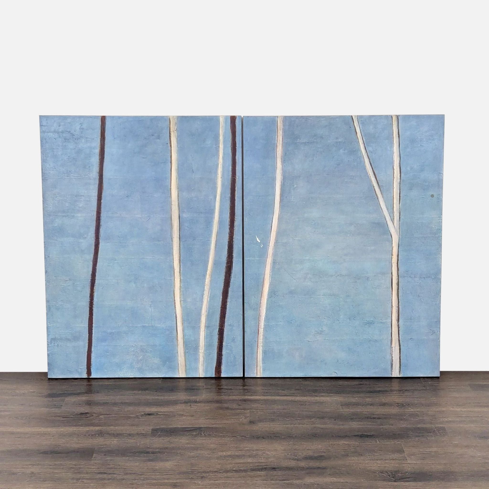 This original artwork by Janine Brown features a minimalist tree design with simple vertical lines against a textured blue background. The piece is painted on two joined wooden panels for a modern, calm look. Ideal for adding a subtle artistic touch to any room. The edges show minor wear, consistent with gentle use. Perfect for fans of contemporary and abstract art.