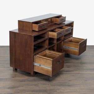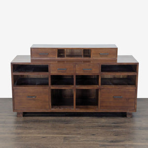Solid wood, with dovetail joints. There are two top drawers, and two file drawers that can fit either letter or legal sized files, plus 7 open shelves and black iron pulls. The Cubby Topper is an additional piece not attached to the credenza.