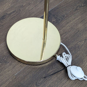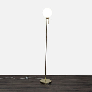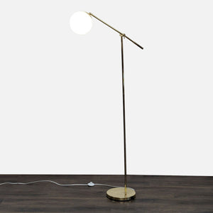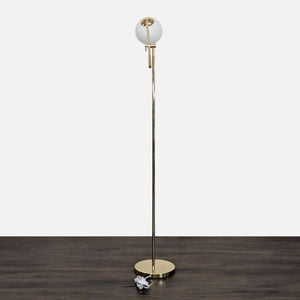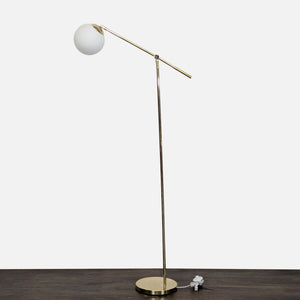 This modern floor lamp features a sleek brass finish and a stylish round base. The adjustable arm lets you direct light where needed, while the frosted glass globe shade gives a soft, warm glow. Perfect for living rooms, bedrooms, or offices, this lamp adds a touch of elegance and practicality to any space.