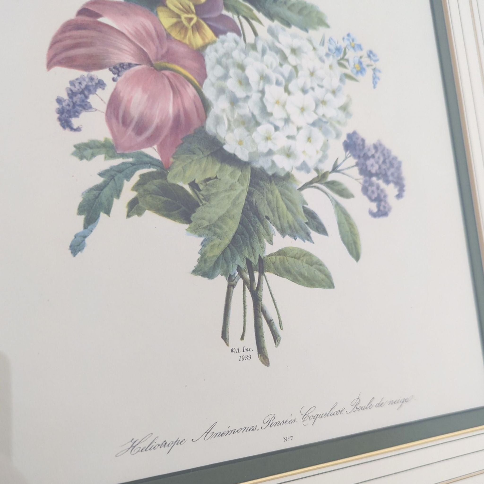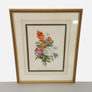 This print features a colorful bouquet of flowers including heliotrope, anemones, pansies, and more. The artwork is dated 1939 and beautifully displayed in a decorative gold frame with double matting. Perfect for adding a classic touch to any room. Ready to hang and in great condition.