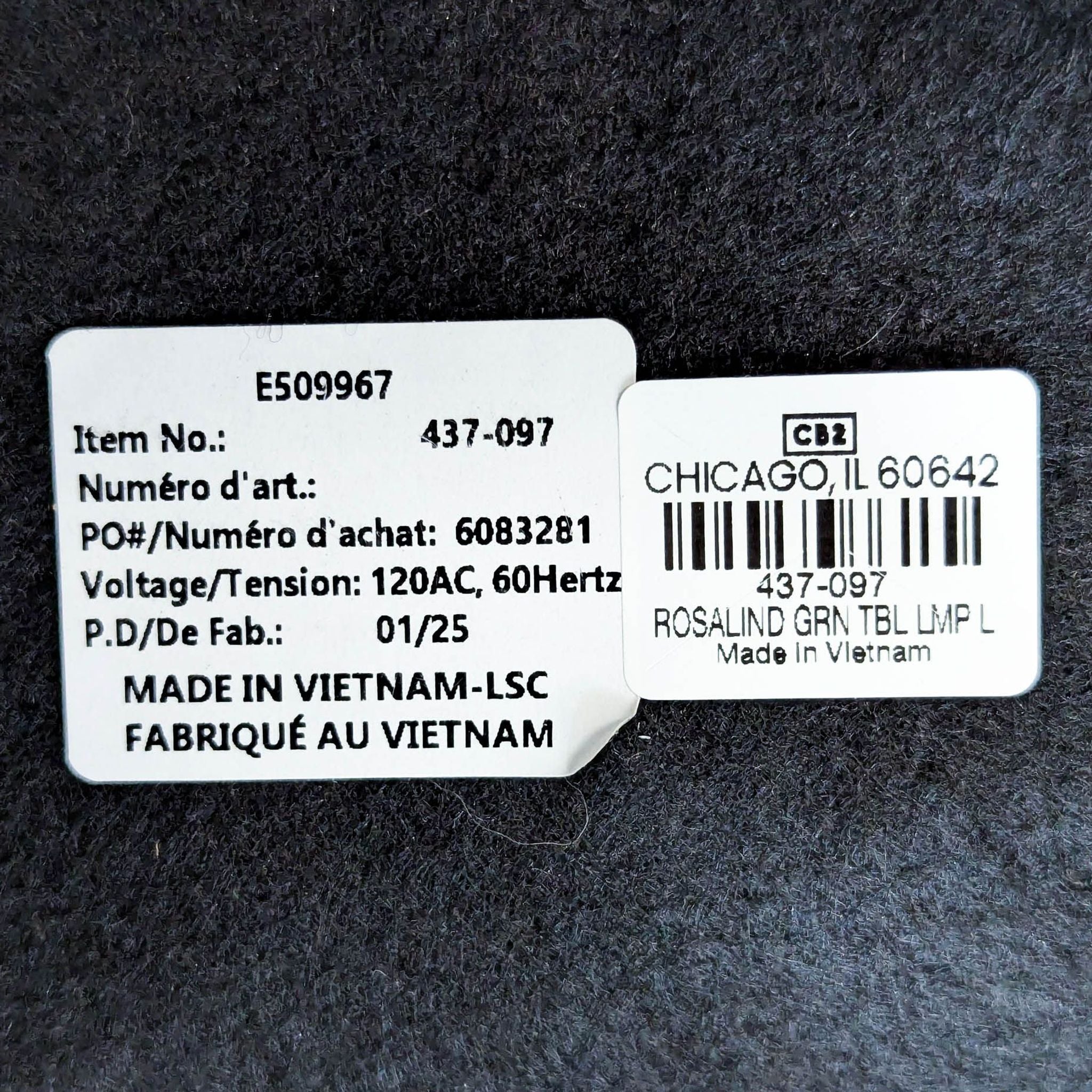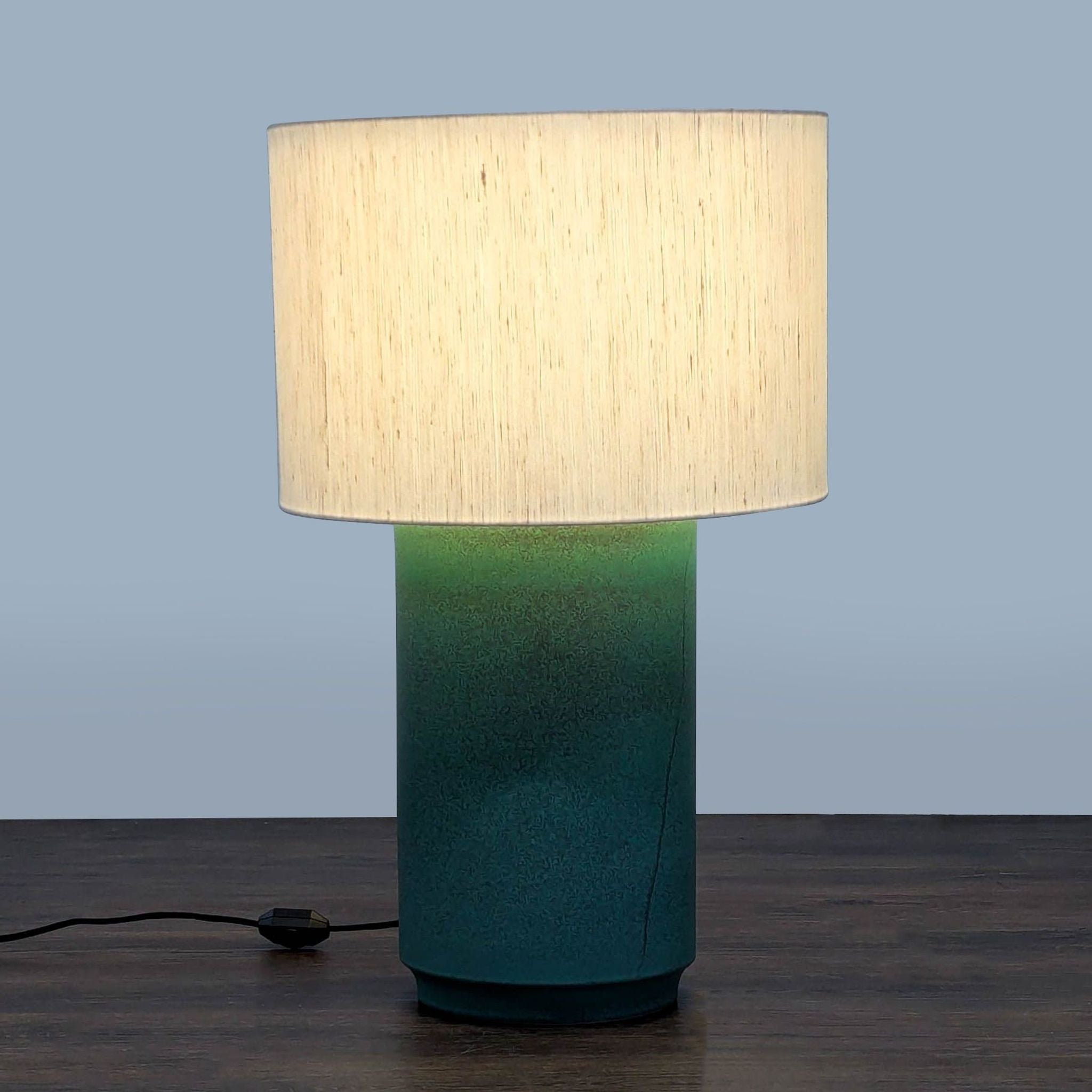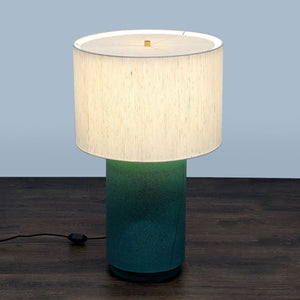 This CB2 table lamp features a simple white drum shade and a stylish green gradient ceramic base. It offers a clean, modern look and warm light, perfect for desks, nightstands, or living rooms. The lamp is easy to use with an inline switch and works well with most home decor styles.