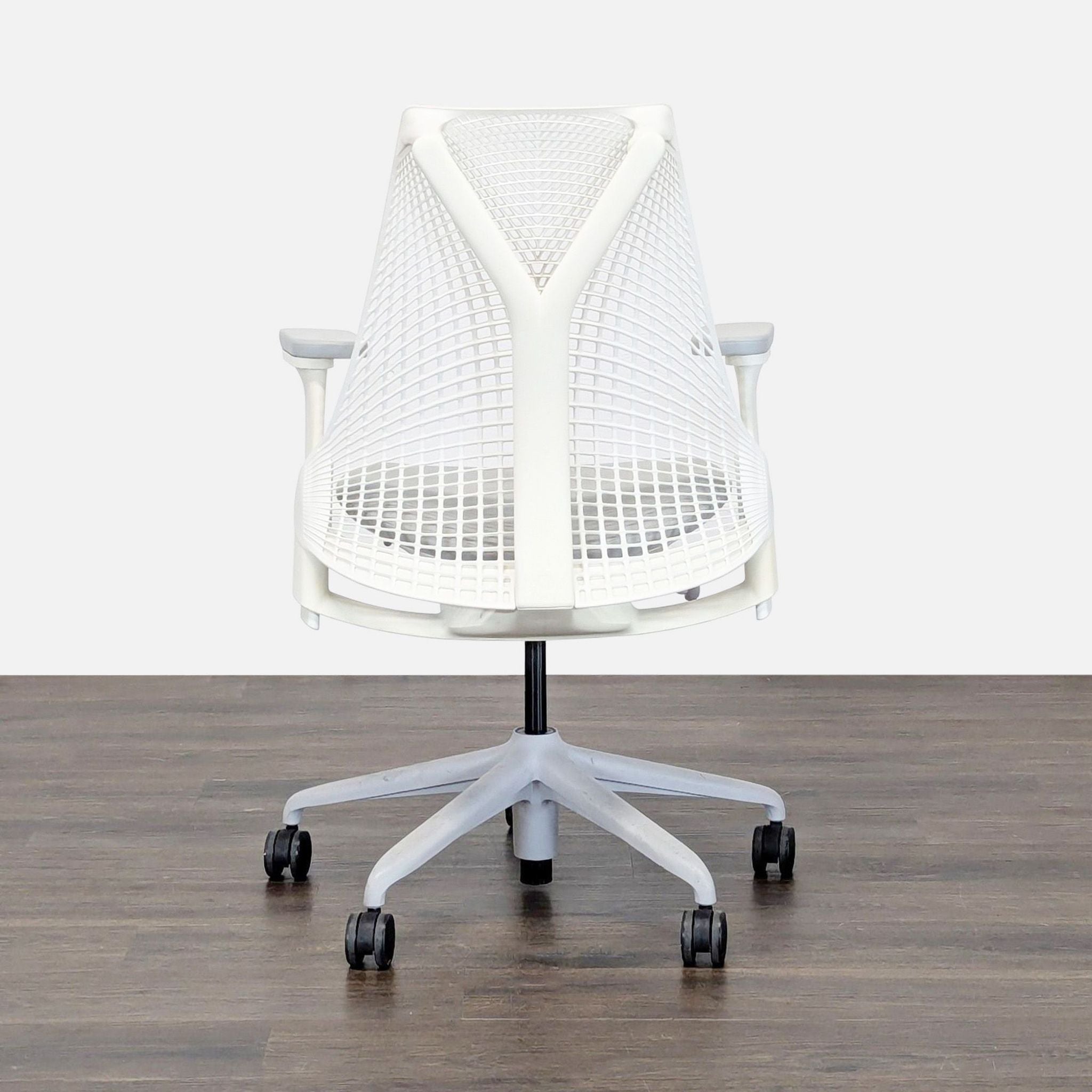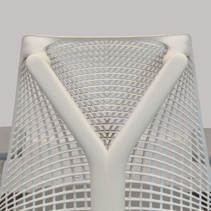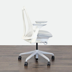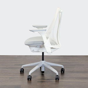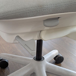 This Herman Miller office chair features a modern white design with a flexible mesh back for comfort and support. It has adjustable armrests, a cushioned seat, and smooth-rolling wheels for easy movement. Perfect for home or office use, this chair is both stylish and ergonomic.