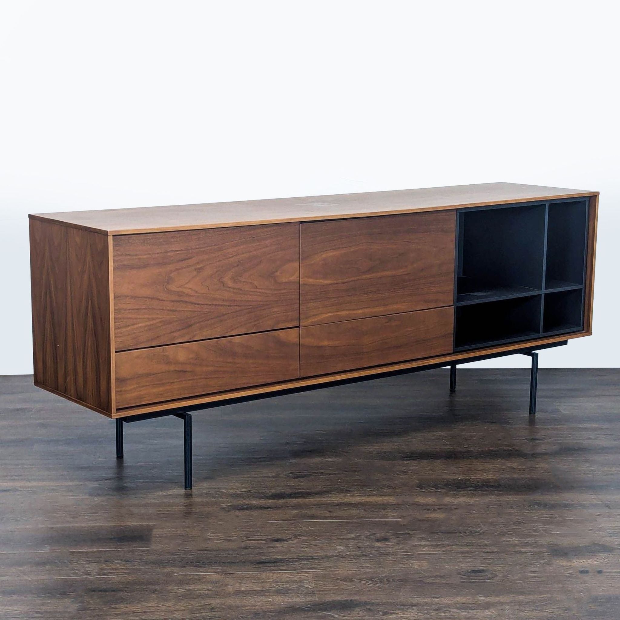 Manufactured in Spain and designed by Angel Marti and Enrique Delamo. Its design is inspired by the past and under the influence of the design culture of the Nordic countries. The metal and wood legs reinforce a retro look. Walnut and oak wood with a hyper-natural finish and a lacquered look.