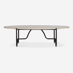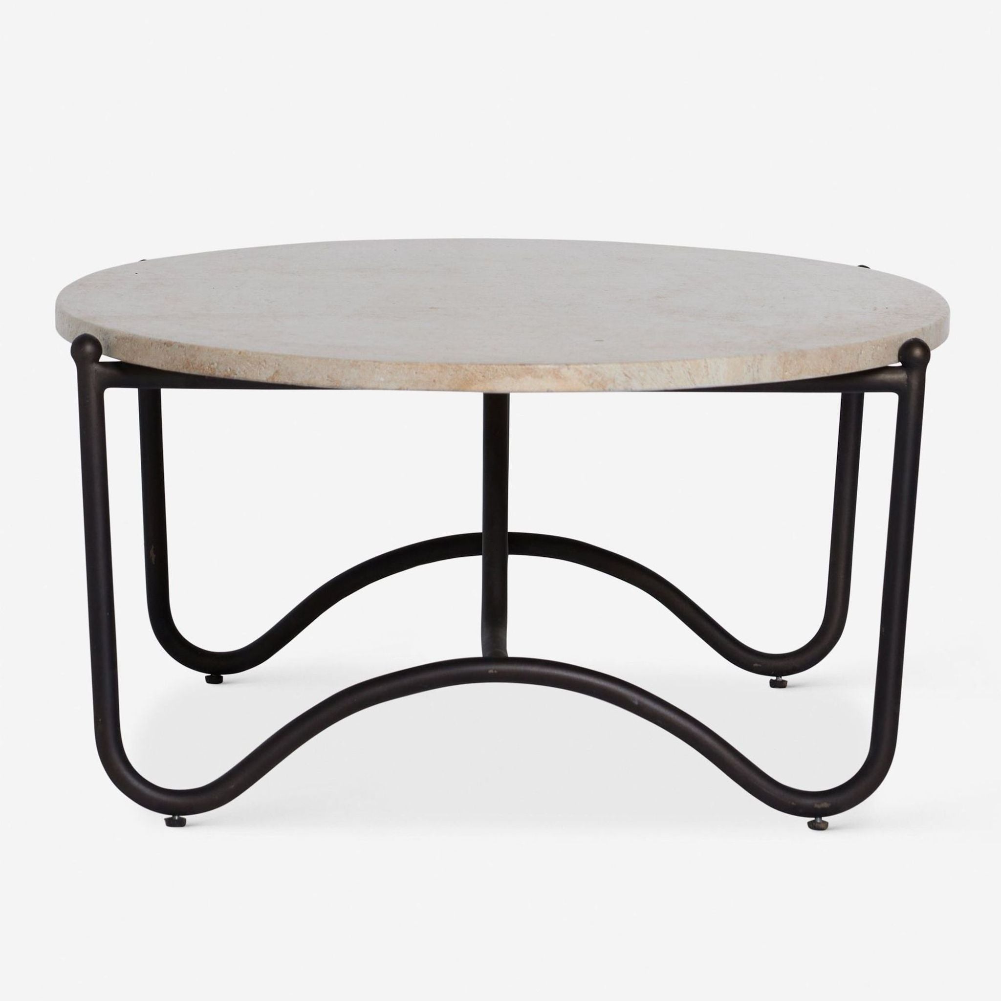 This Lulu and Georgia coffee table features a round travertine stone top and a sturdy black metal base. The smooth stone surface is easy to clean, while the curved metal legs add a modern touch. Perfect for living rooms, it combines durability with simple, stylish design.