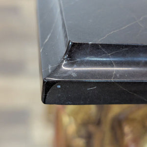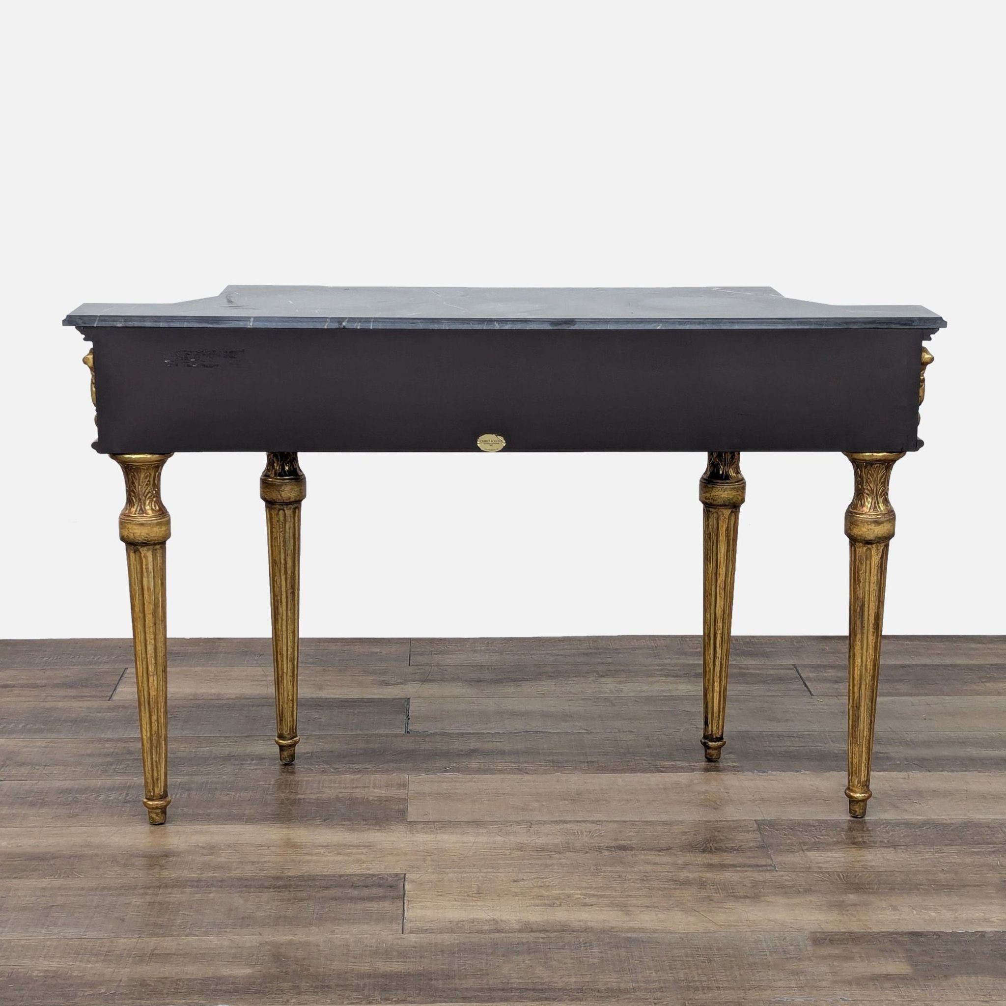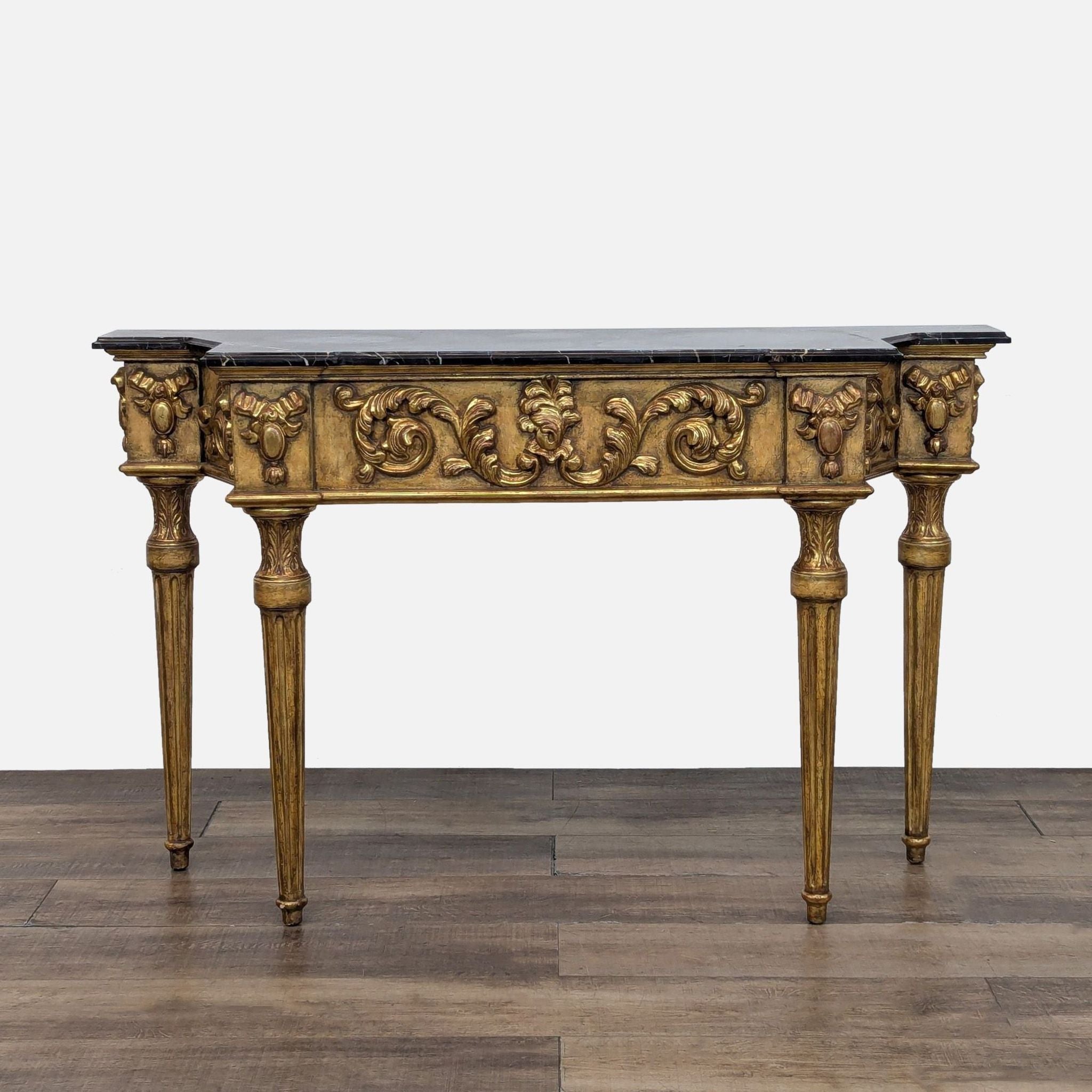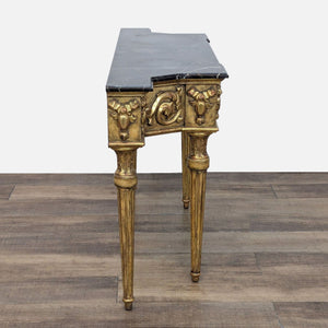Three-sided gilded console with intricate carved details, four fluted legs, and marble top