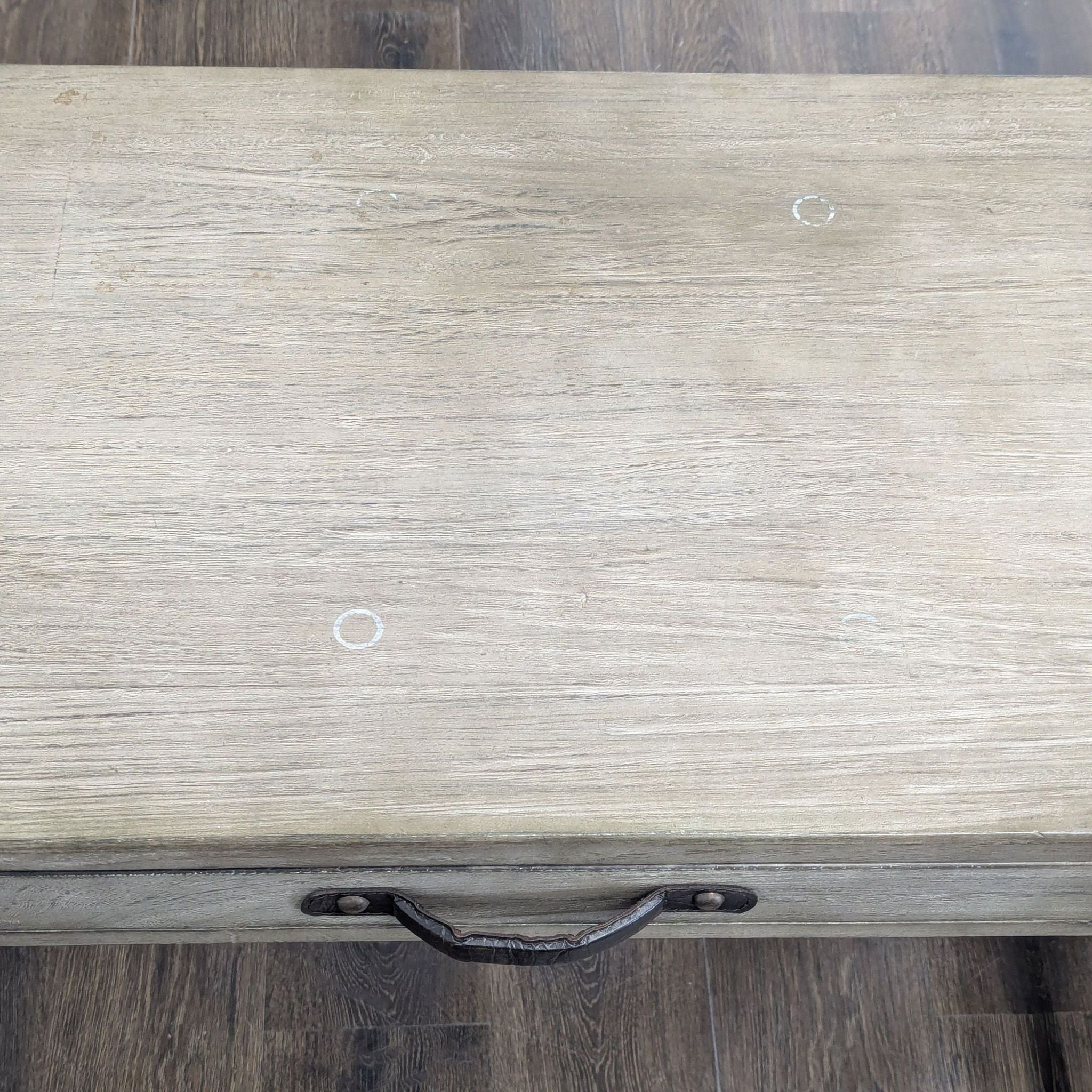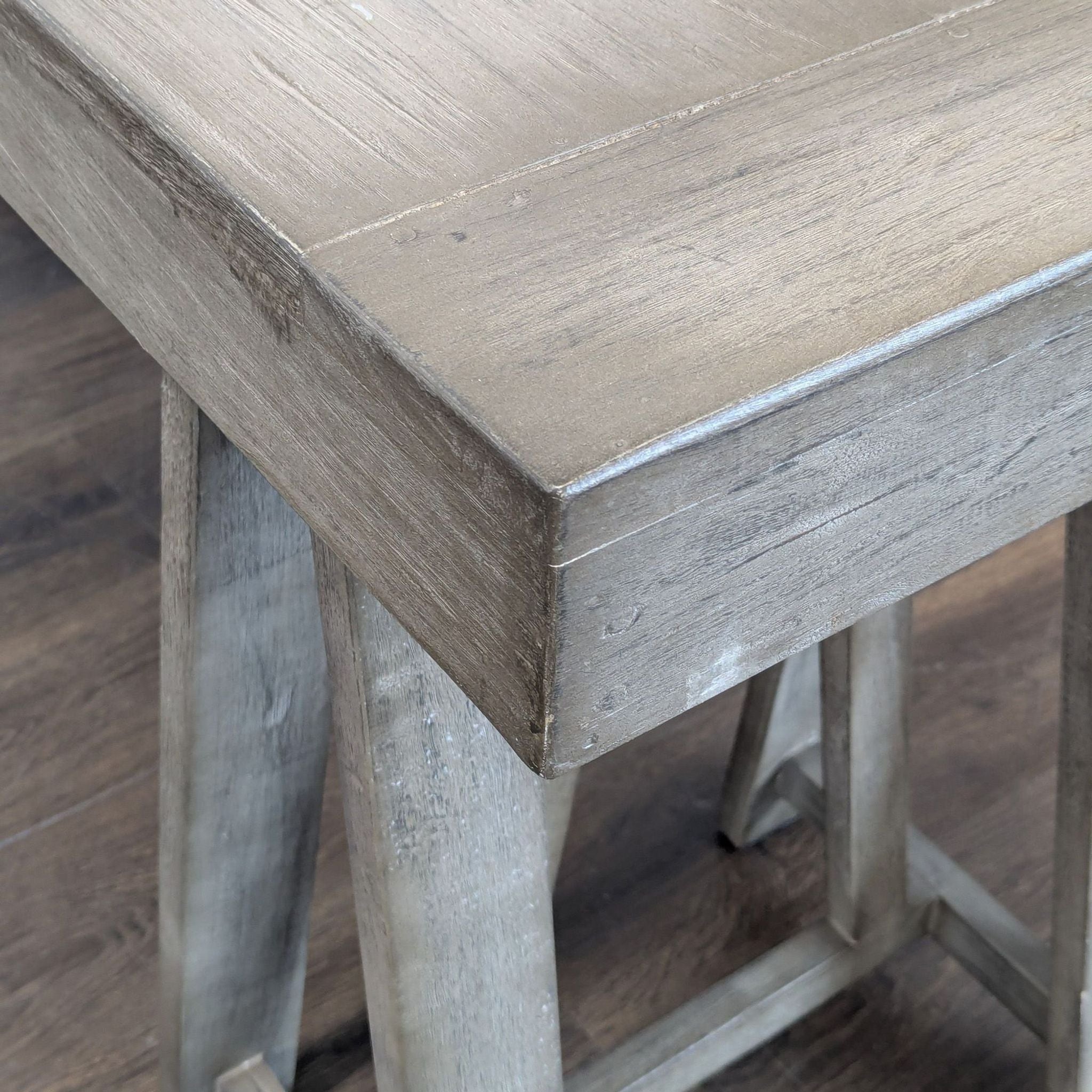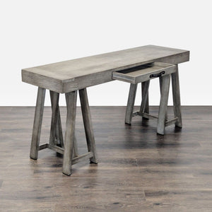This World Market desk features a sturdy wooden construction with a stylish gray finish. Its wide tabletop provides plenty of space for work, and the unique sawhorse-style legs add a modern touch. The desk is perfect for home offices or study spaces, combining both durability and a contemporary look.