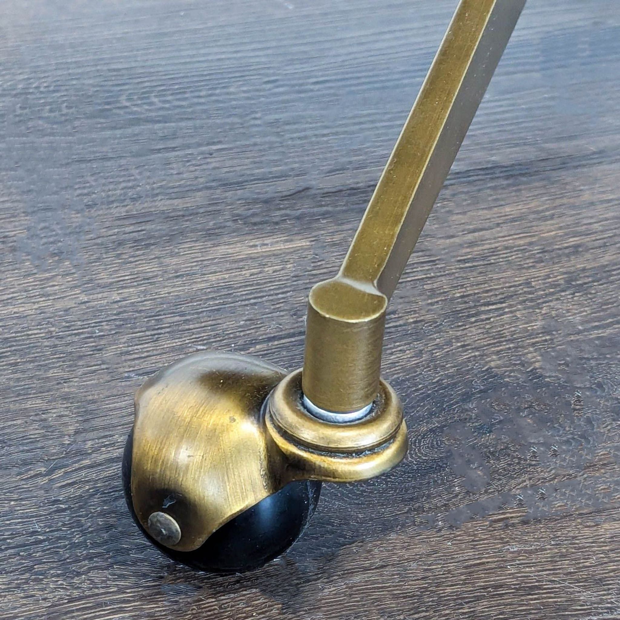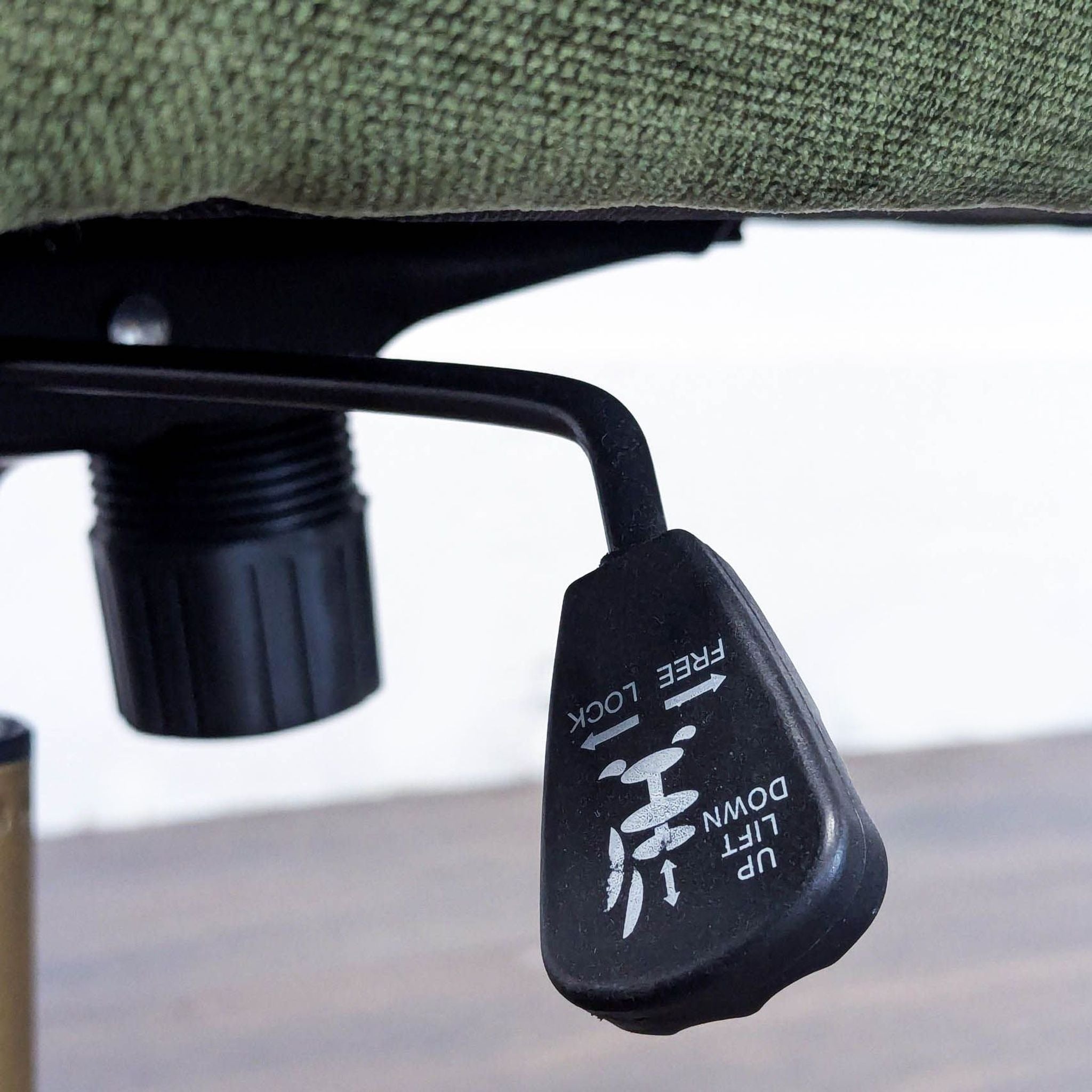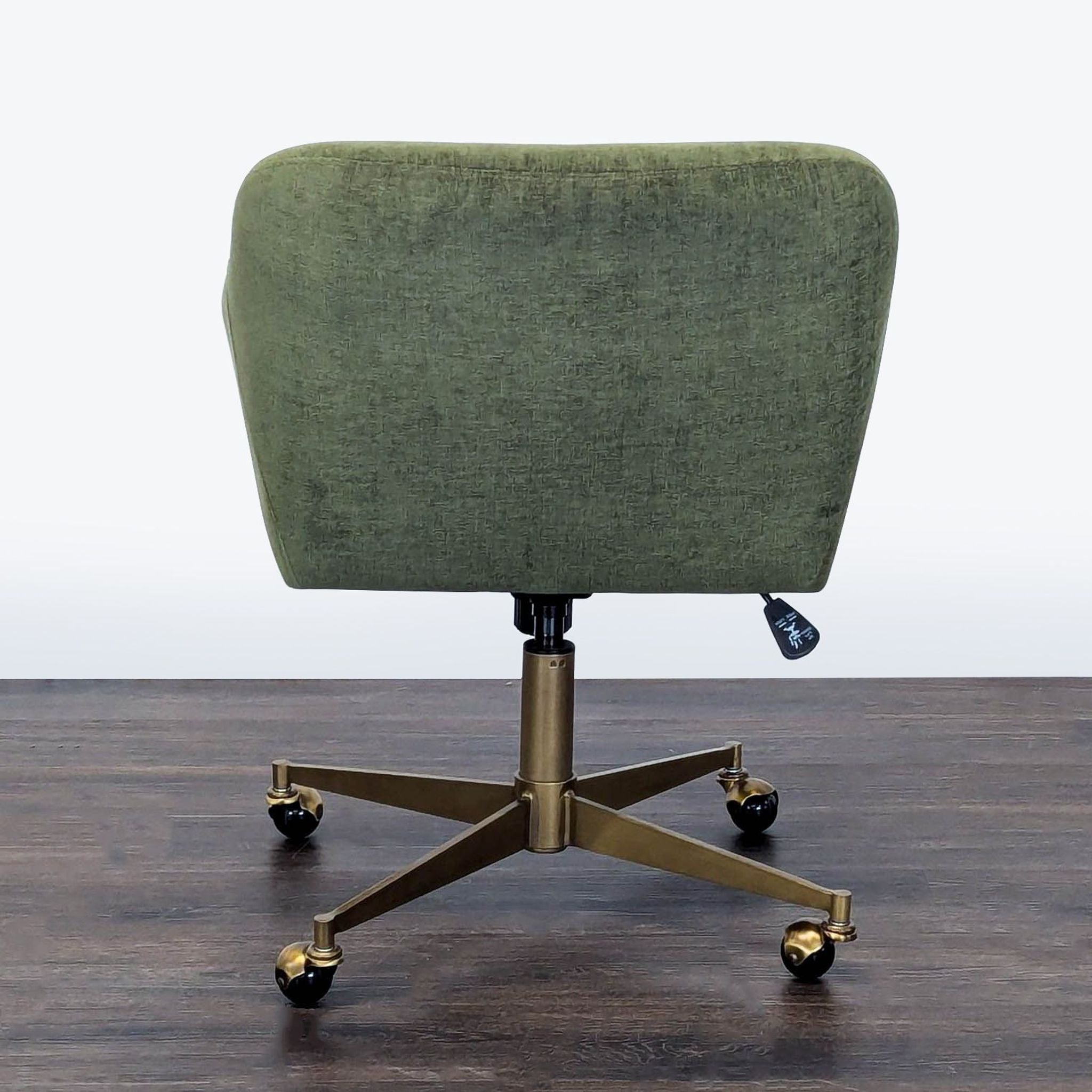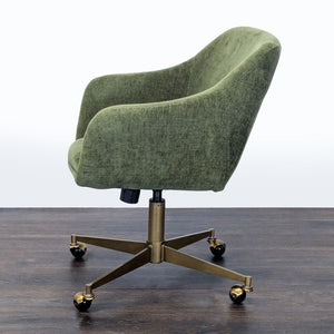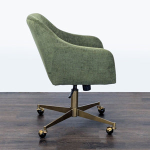 This comfortable chair from World Market features soft green upholstery and supportive armrests. The sturdy brass base comes with smooth-rolling wheels and an adjustable height lever for easy movement and personalized comfort. Perfect for your home office or workspace.