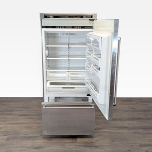 This Viking Professional refrigerator offers a spacious interior with adjustable shelves, multiple door bins, and two crispers for fresh produce. The bottom freezer provides easy access to frozen foods. Its stainless steel finish is durable and gives a modern look to any kitchen. Perfect for anyone looking for a reliable and high-quality fridge.