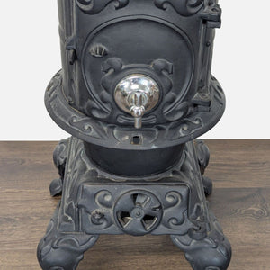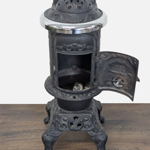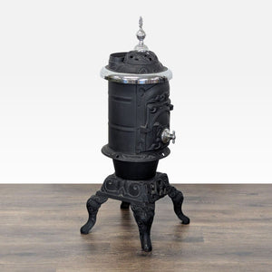 This antique cast iron parlor stove is a stunning addition to any home. It features ornate detailing with elegant silver accents and a decorative finial on top. The stove stands on curved legs and has a classic front-loading door. Perfect for vintage decor or practical heating needs. Sturdy and eye-catching, it will make a beautiful statement piece in any room.