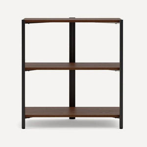 This Burrow bookshelf features three spacious shelves with a dark wood finish and sturdy black metal frame. Its simple, modern design fits any room style. Perfect for organizing books, decor, or storage items. Easy to assemble and built to last.