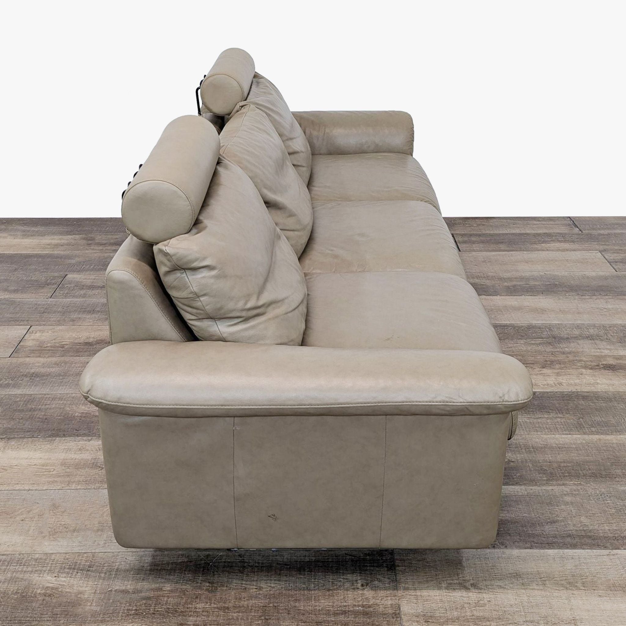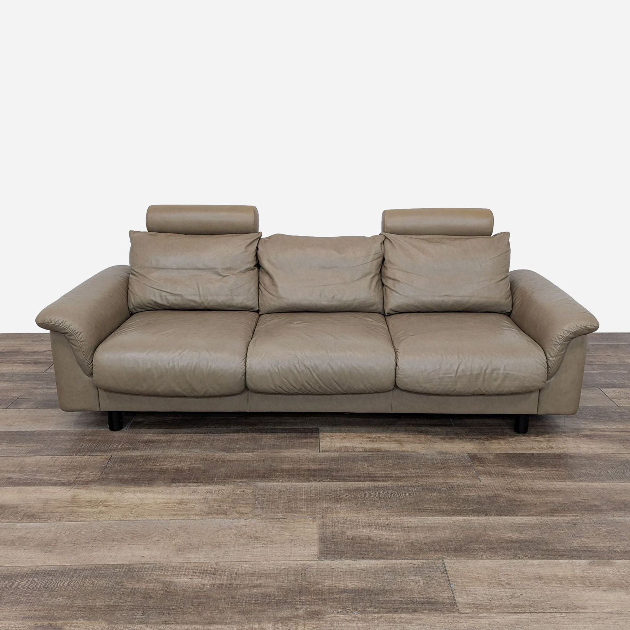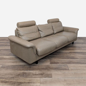 Ekornes Stressless Sofa E300 with adjustable Headrest upholstered in Paloma Taupe Leather.