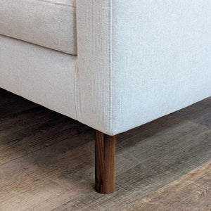Features tailored blind-tufted seating and back with high density, high resiliency foam cushions and walnut legs. The extended seat can be moved around to suit your space.
