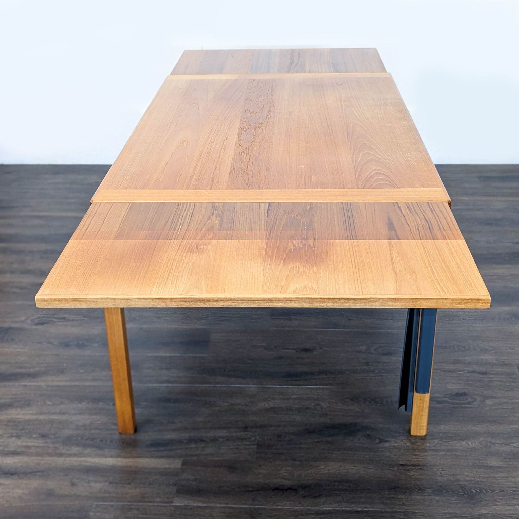 Leaves pull out from under the table. 55 inches without leaves and 94.5 inches when fully extended