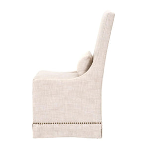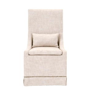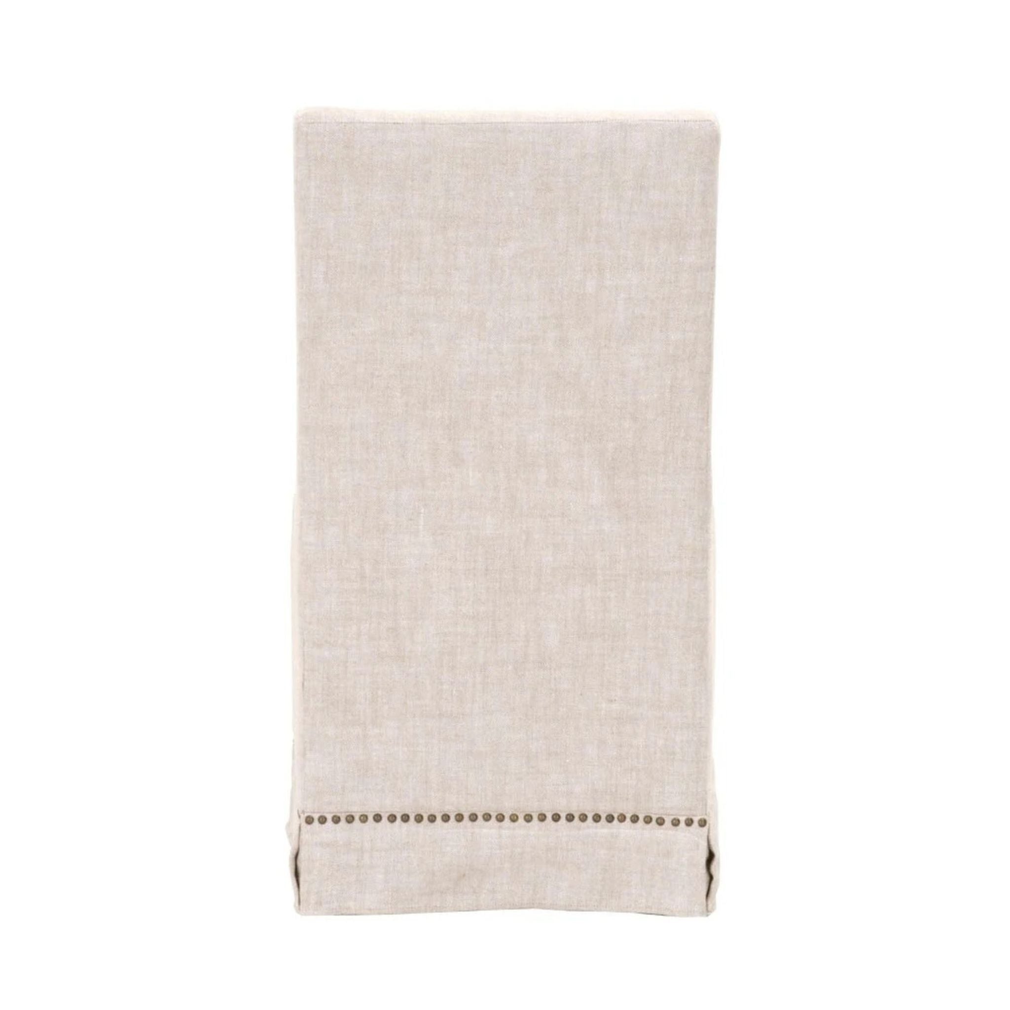The chair is covered in Bisque French Linen with Gold Nails. It is slipcovered and includes a lumbar pillow. The seat cushion is removable.