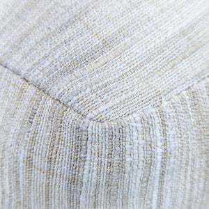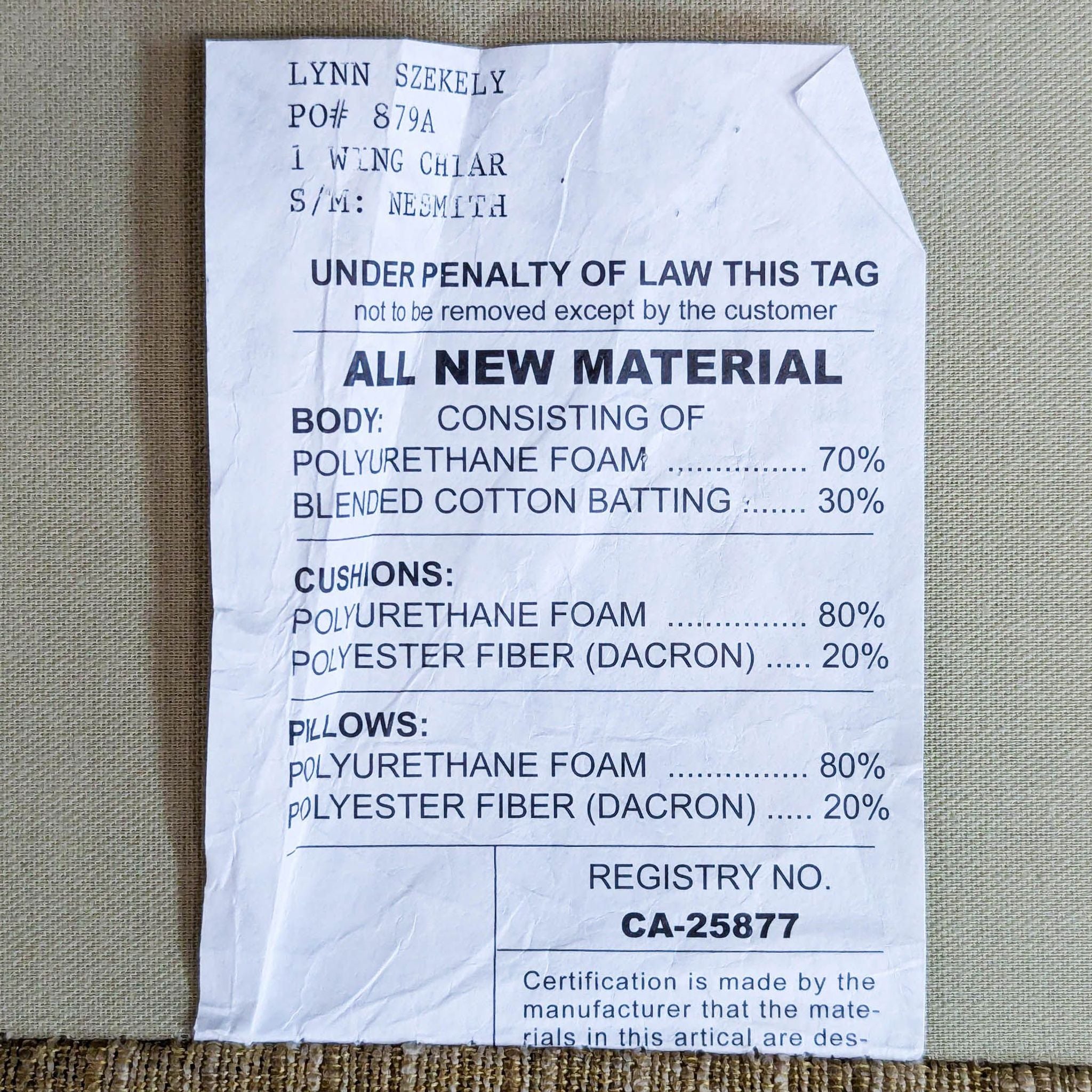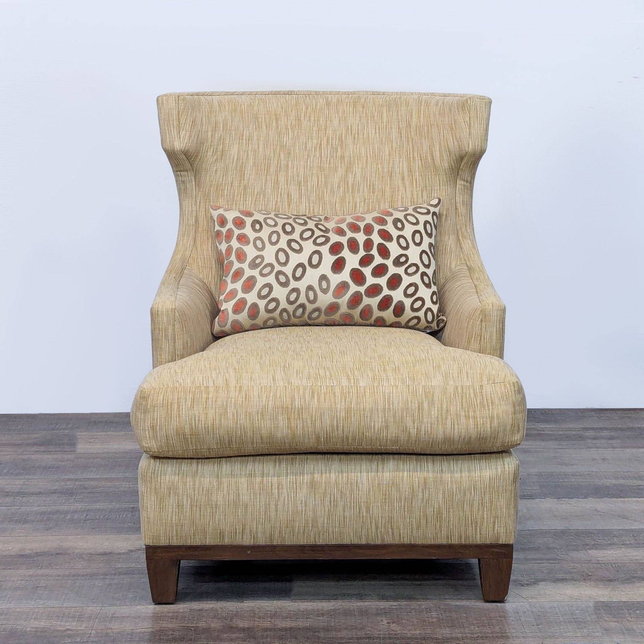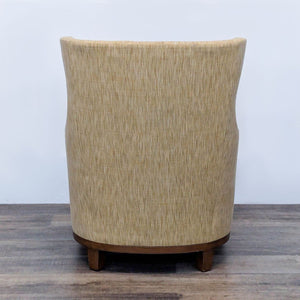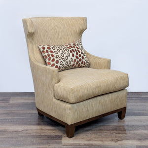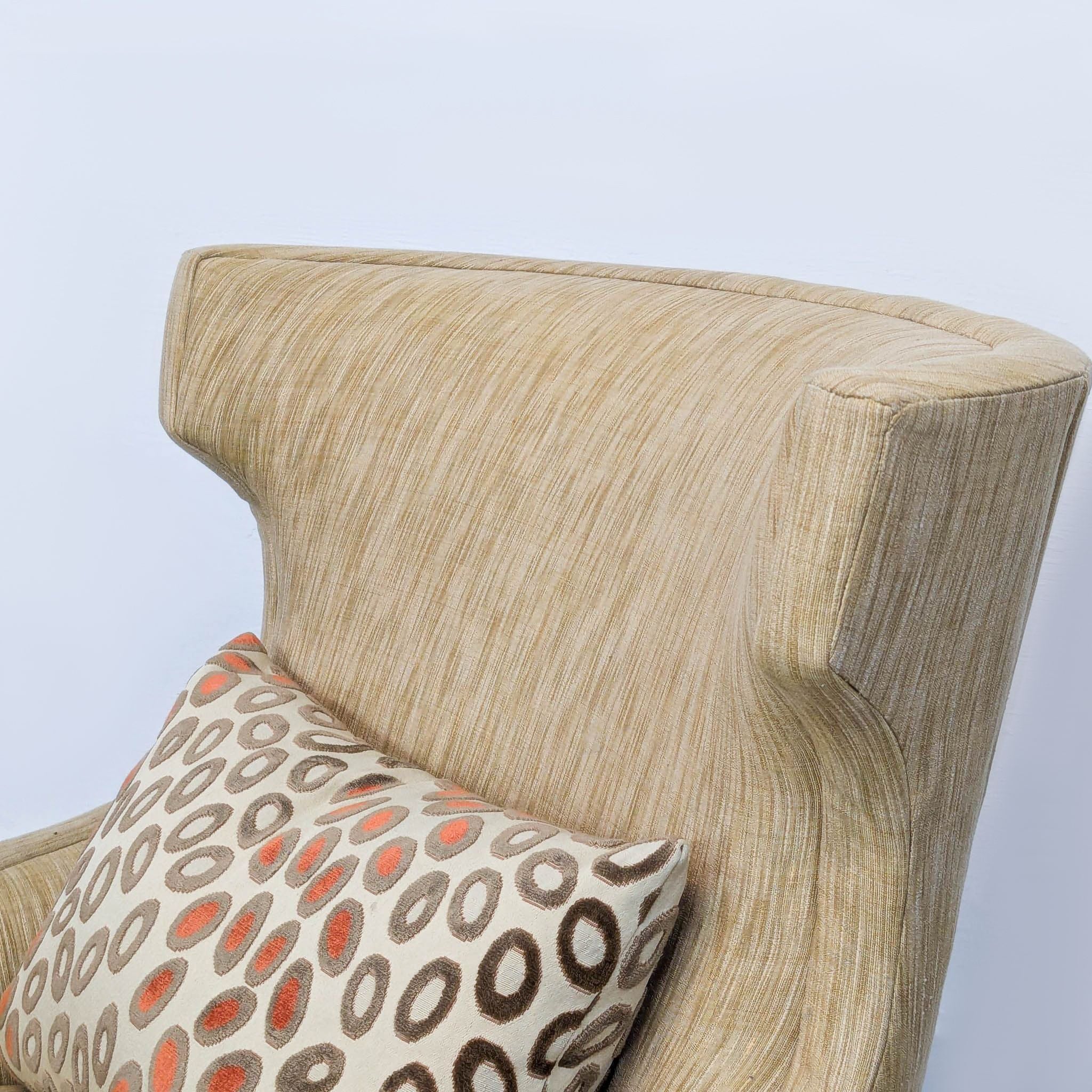 High wingback chair with curved back, wood base and neutral upholstery.