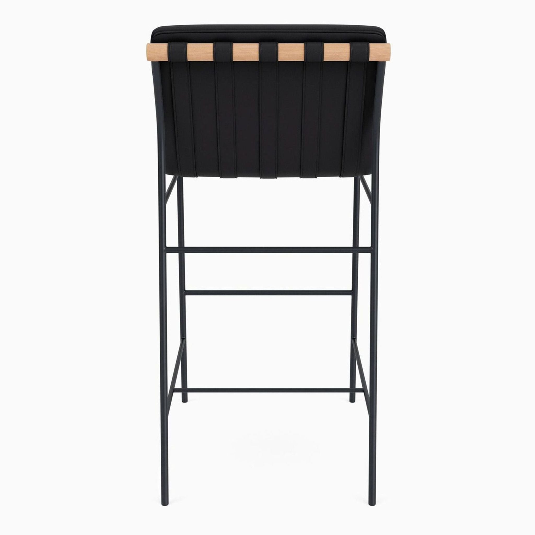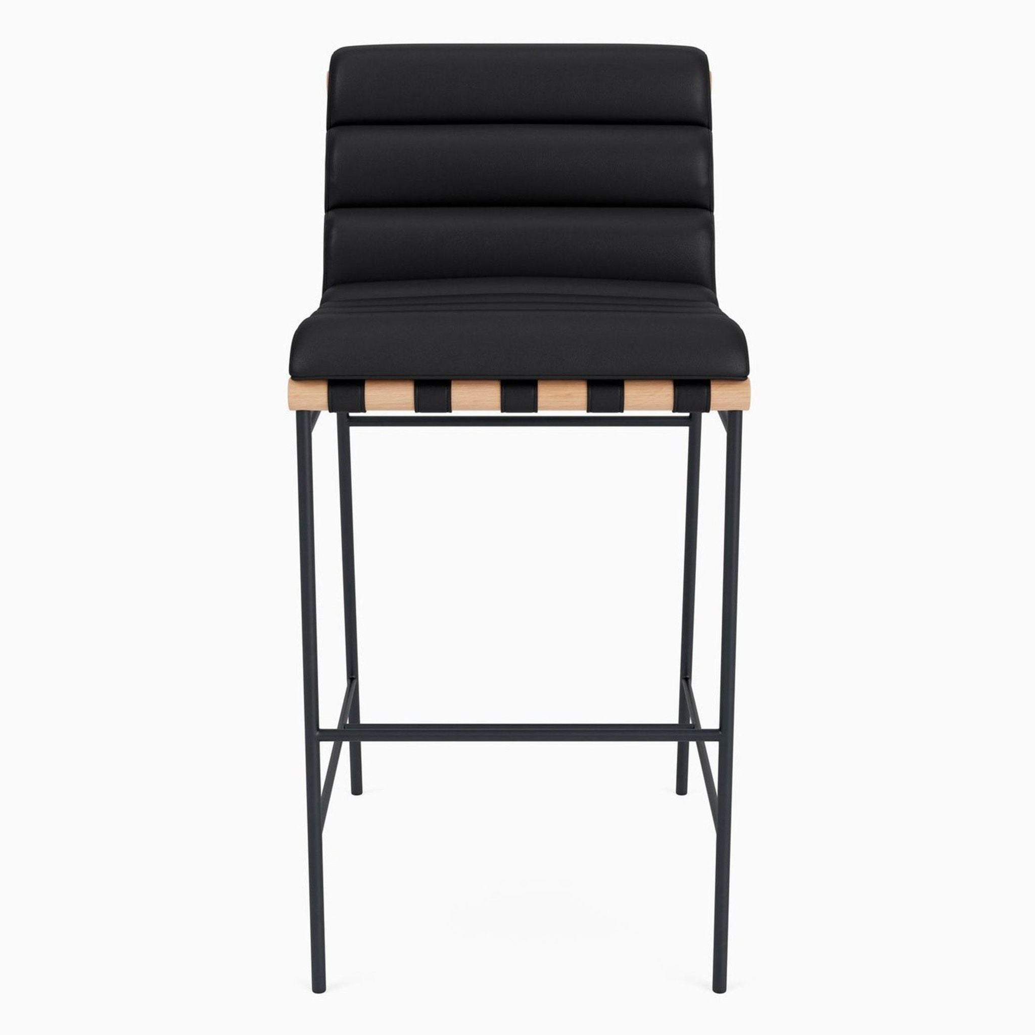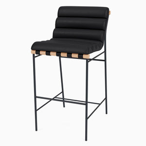 This stool has a solid white oak wood dowel, channel-tufted leather upholstery, and leather strap detailing. It has a powder-coated steel frame and high-density foam padding.