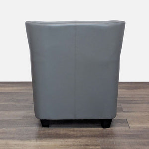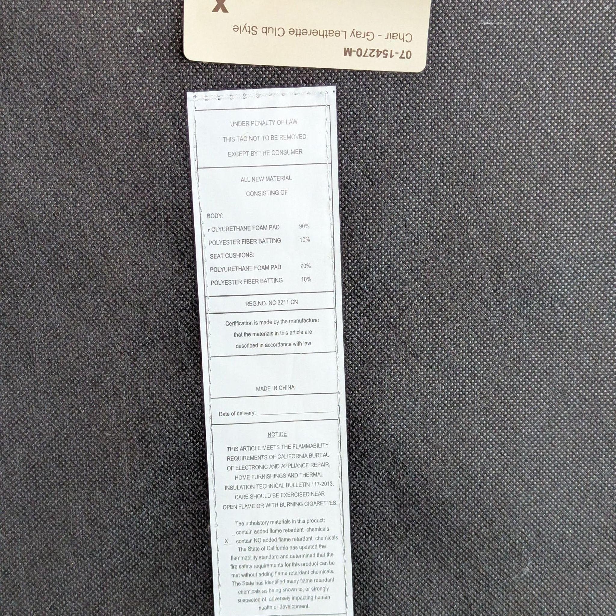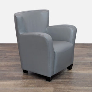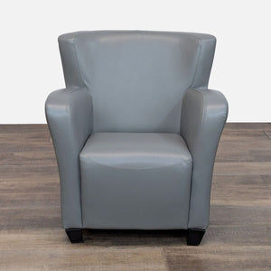 Features rounded track style arms, faux leather upholstery and tapered wood feet.