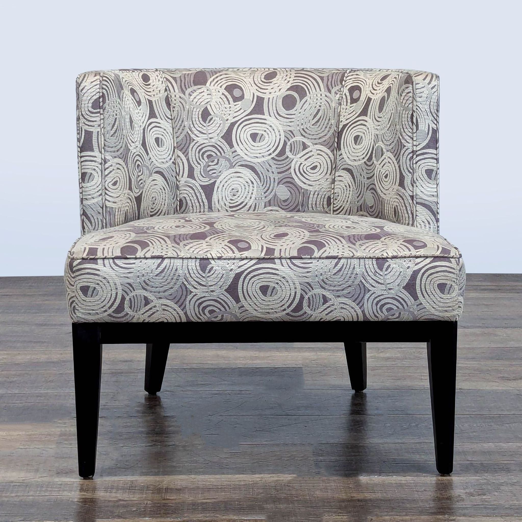 The Crate and Barrel Grayson chair is a barrel-back accent chair featuring tailored upholstery, a curved back with a squared seat, and a distinctive lower base with tapered wood legs.