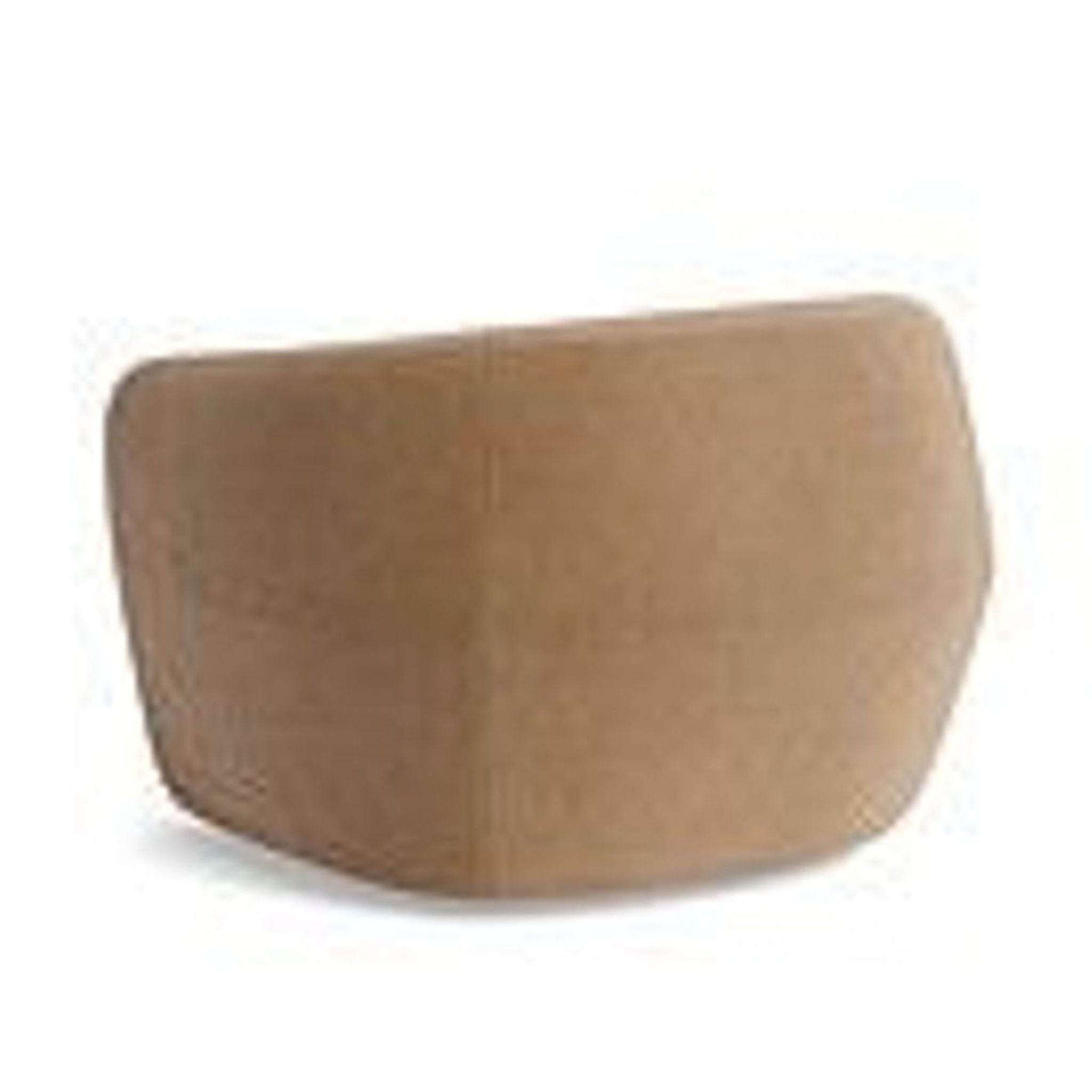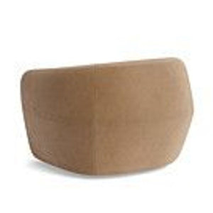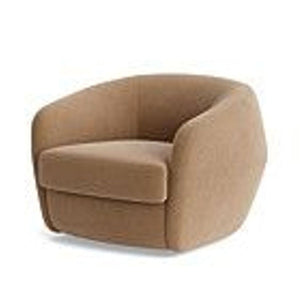 Barrel back chair with thick seat cushion and velvet upholstery.