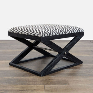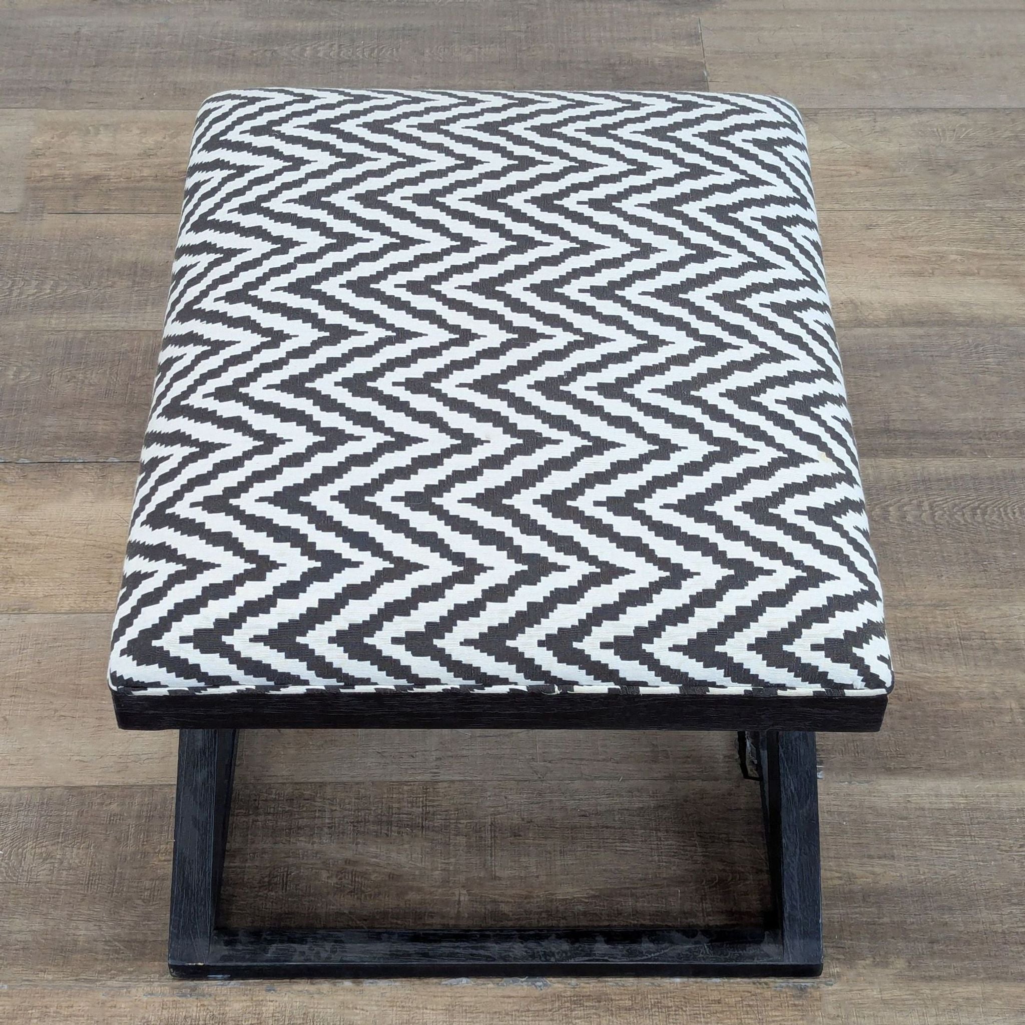 Ottoman with a padded seat, covered in a black and cream chevron pattern fabric, on a wood X frame