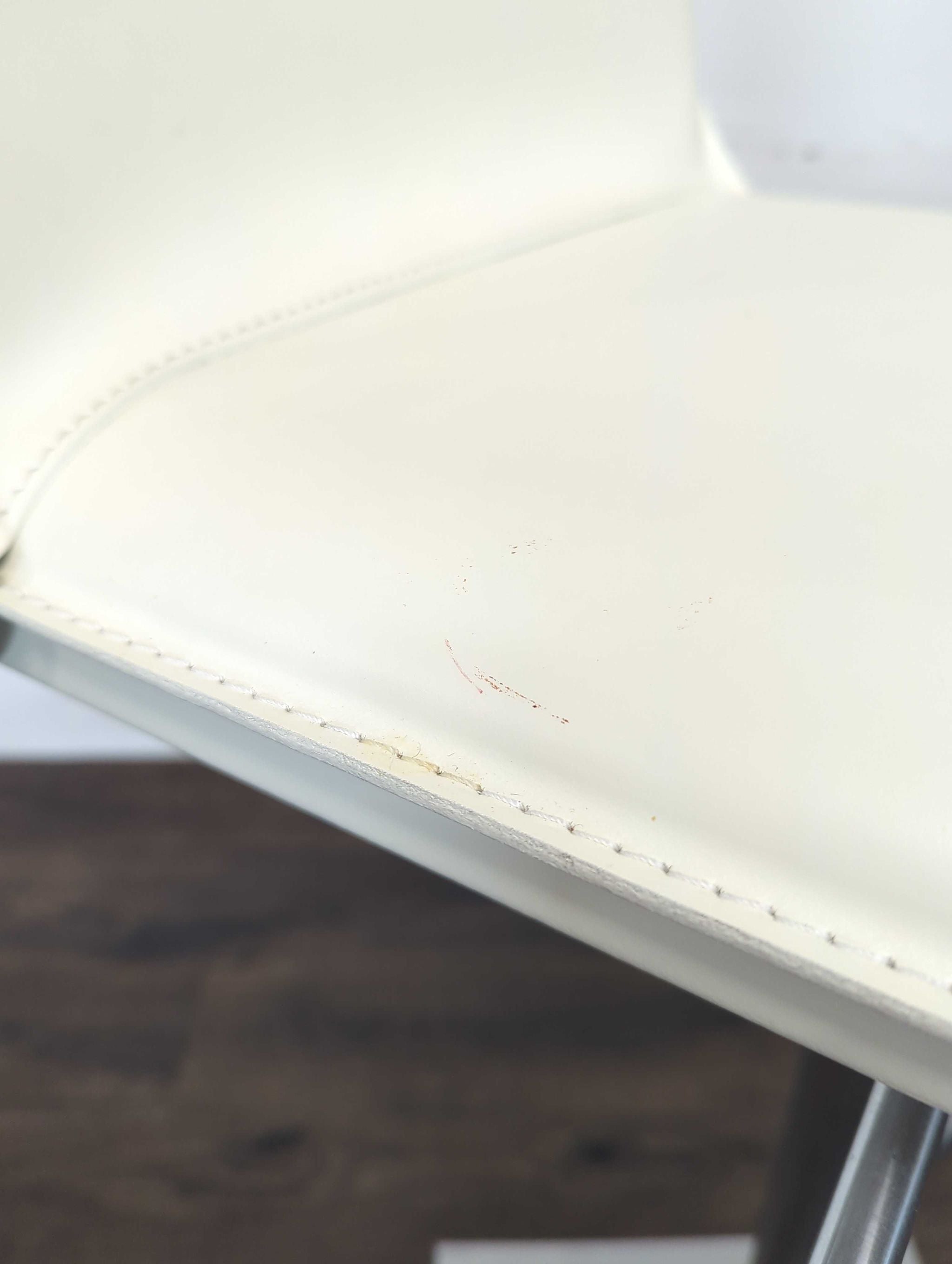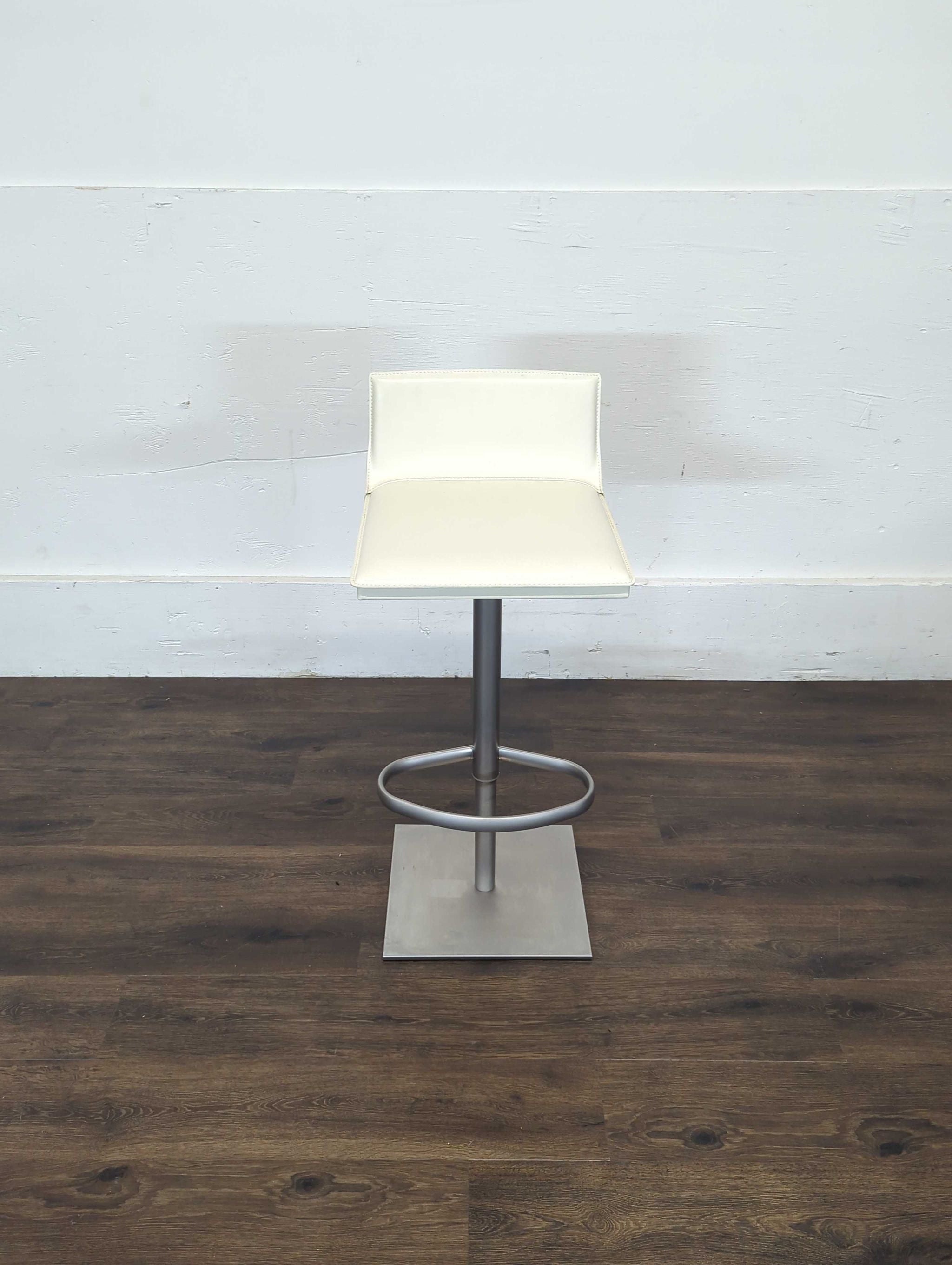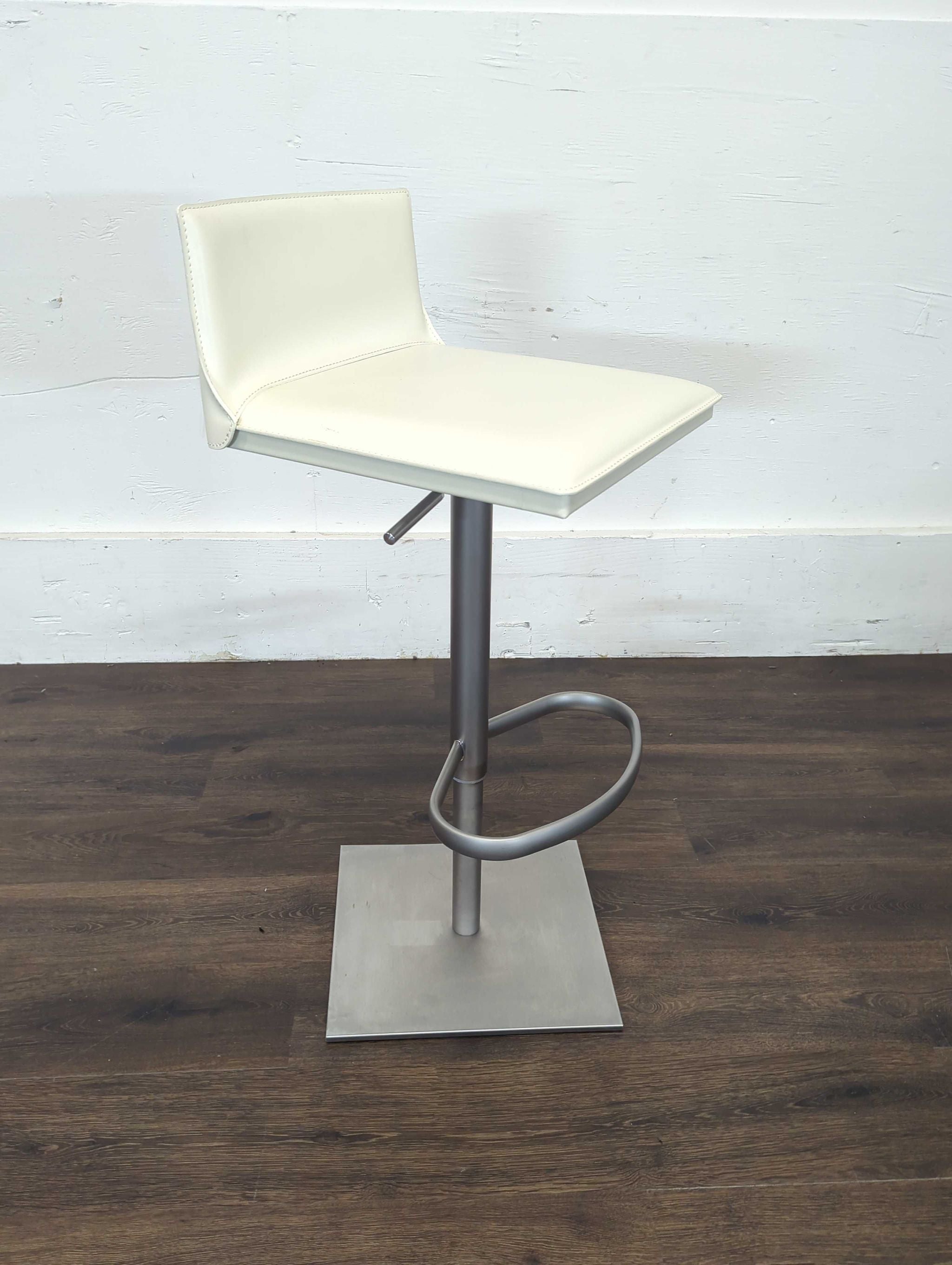 Hand sewn stain-resistant leather. Features a gas piston lift and36 degree swivel. Height adjustable for counters and bars.