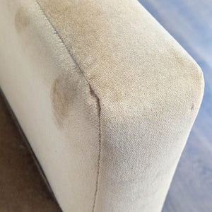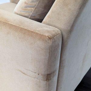 This Room and Board lounge chair features a soft tan upholstery and a sleek, modern design. It reclines for extra comfort and has sturdy wooden legs, making it perfect for relaxing in any living space. The chair is in good condition and ready to be enjoyed in your home.