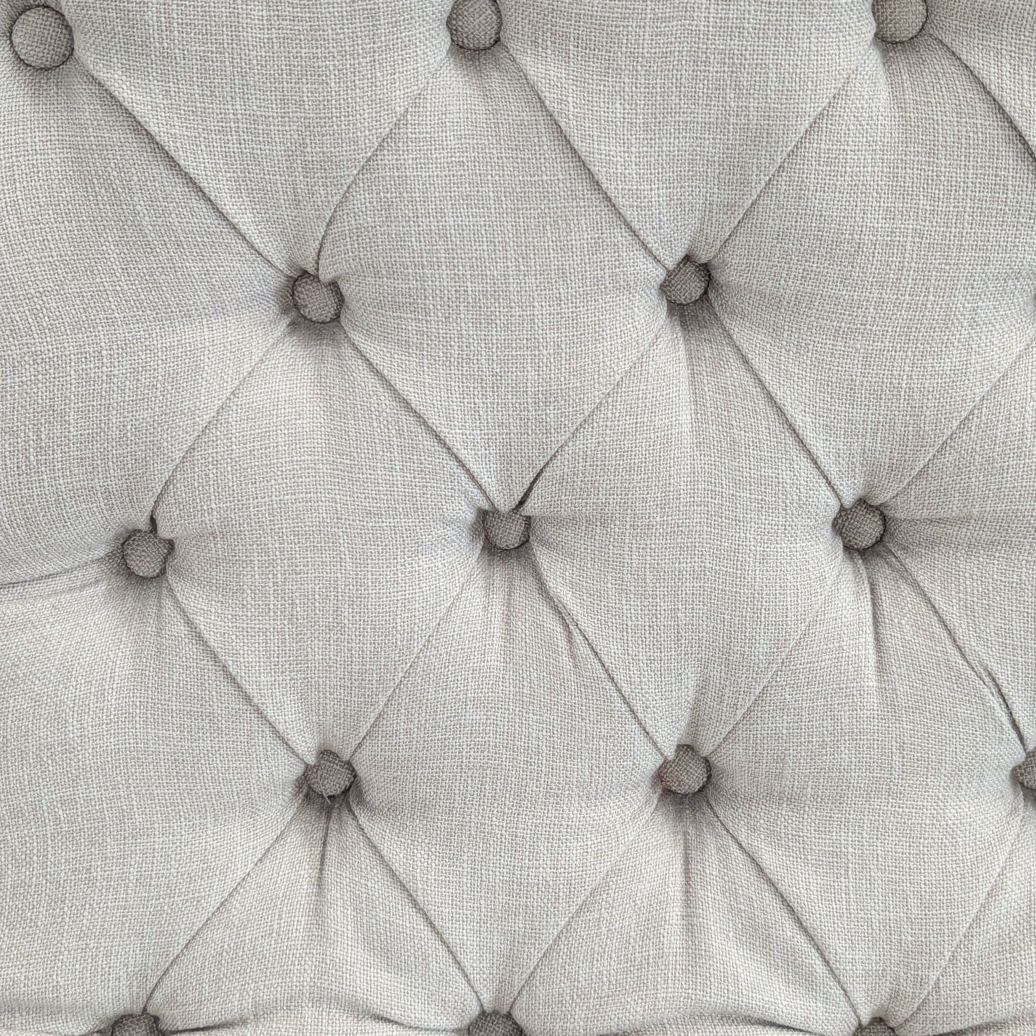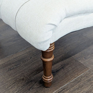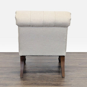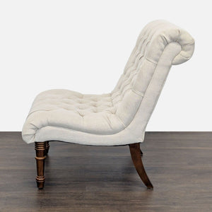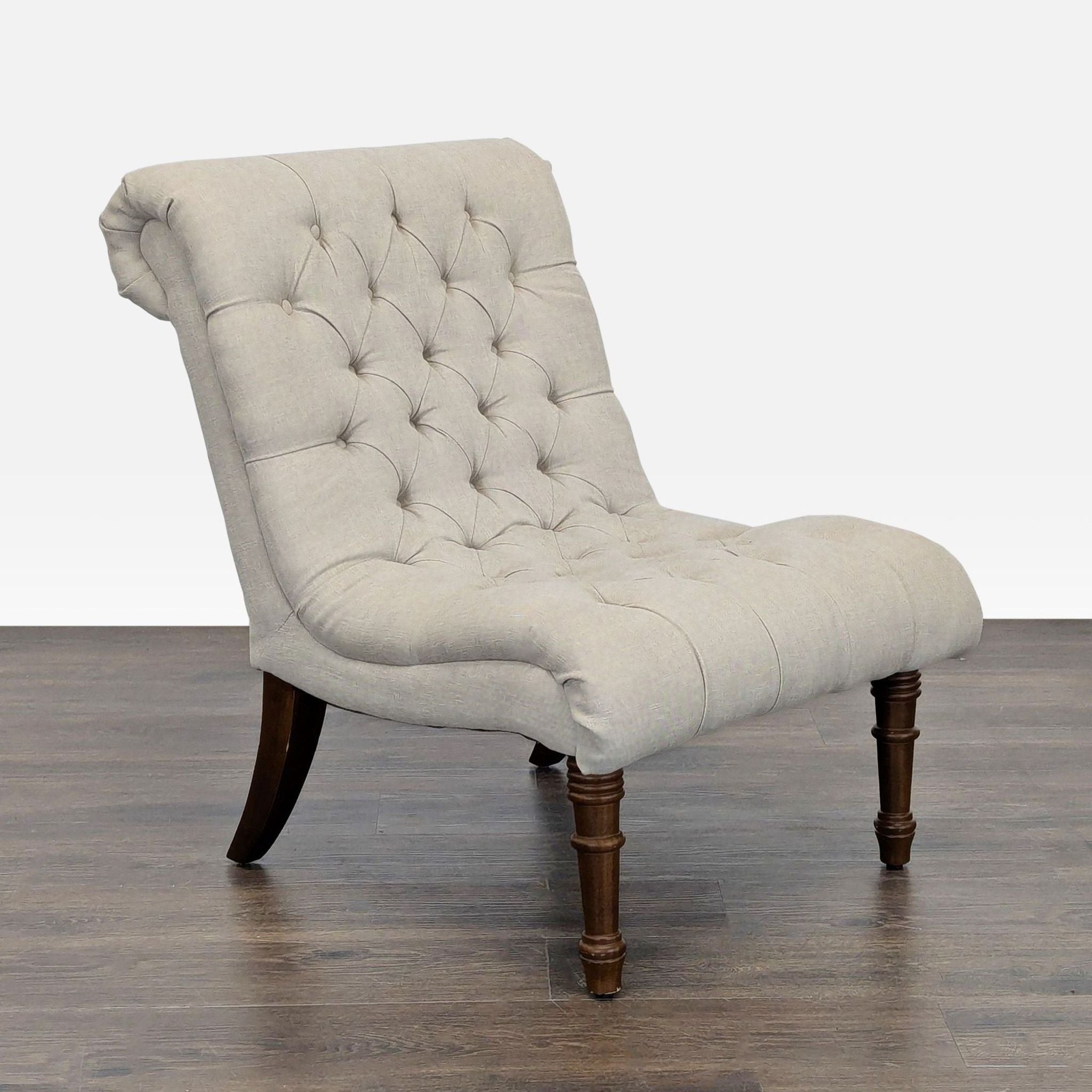 This lounge chair features a stylish beige tufted seat and back, offering both comfort and elegance. The armless design and soft fabric make it perfect for relaxing in any living room or lounge area. Sturdy wooden legs add a touch of classic charm and durability. Great for reading or as an accent piece in your home.