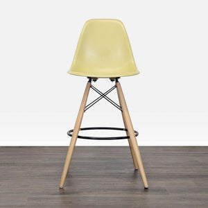 Mid-Century style with plastic bucket seat on wood legs with metal footrest