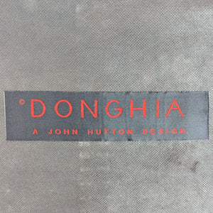 Designed by John Hutton for Donghia the Eaton chair features flared arms, tufted upholstery, and tapered inverse pyramid feet.