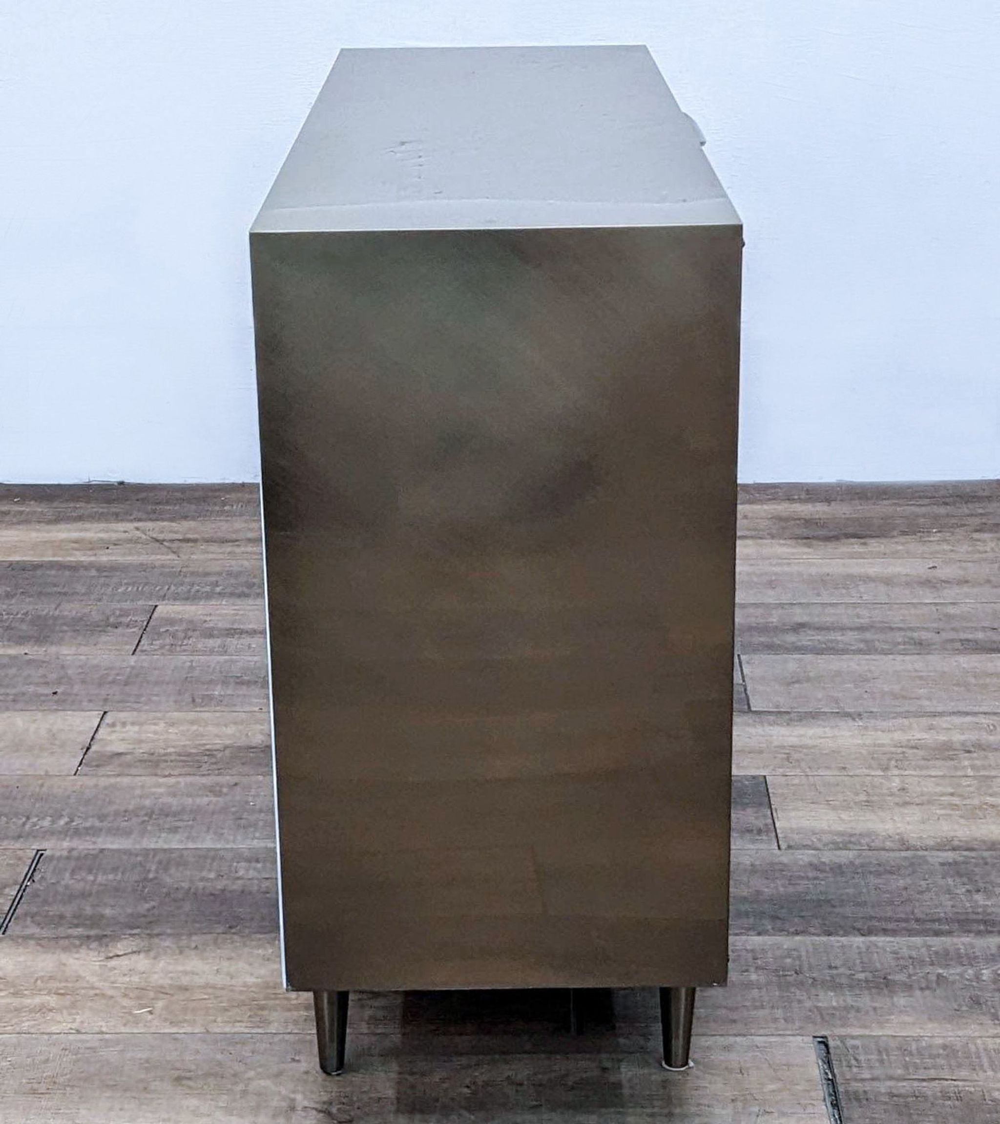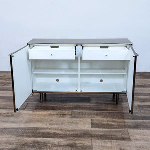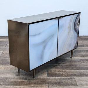 Brushed gold and white finish with 2 drawers and 2 agate printed acrylic doors. there are 2 adjustable shelves behind each door with agate printed door panels and mineral inspired patterns. The unit has conical feet.
