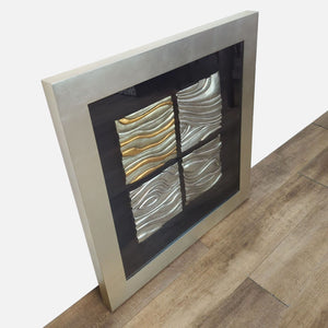 Framed decorative wall panel featuring four textured squares. Each square exhibits a wavy, organic pattern, and one of the top squares is distinguished by a gold finish, contrasting with the silver/grey finish of the other three. The panel is set within a silver-toned frame, with a black background behind the textured squares.