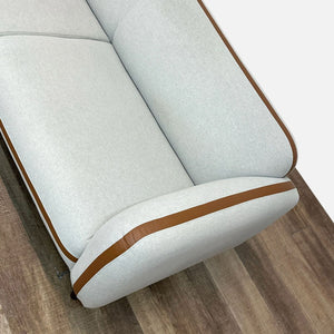 The Nielson sofa has modern style covered in fabric upholstery with leather trim and solid wood legs.