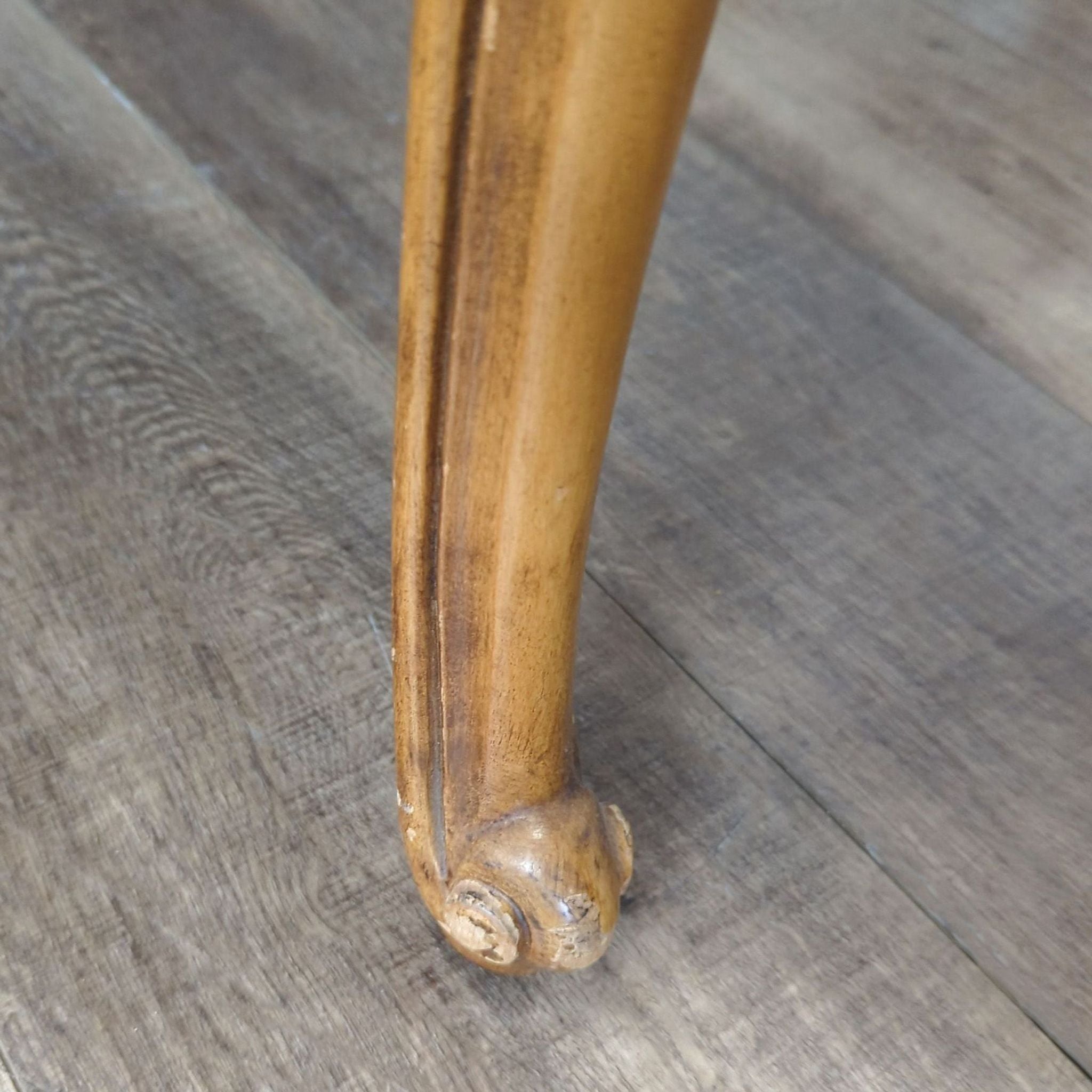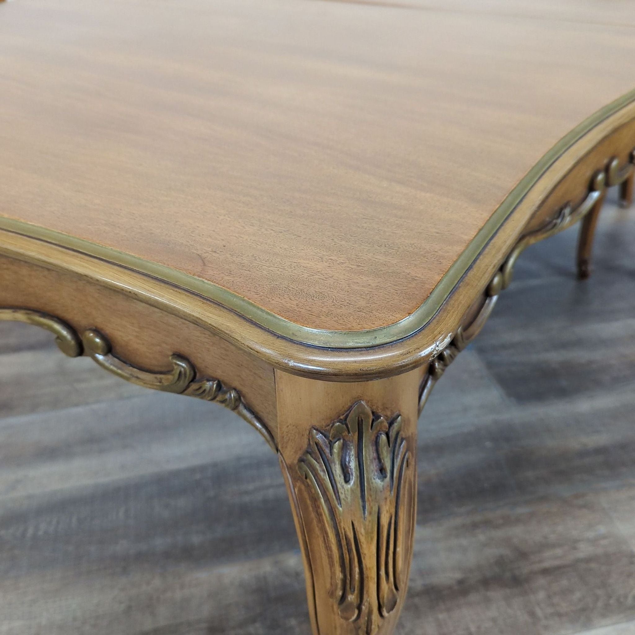 Includes dining table with wood carved accents and 4 side chairs and 2 arm chairs all with upholstered seats.