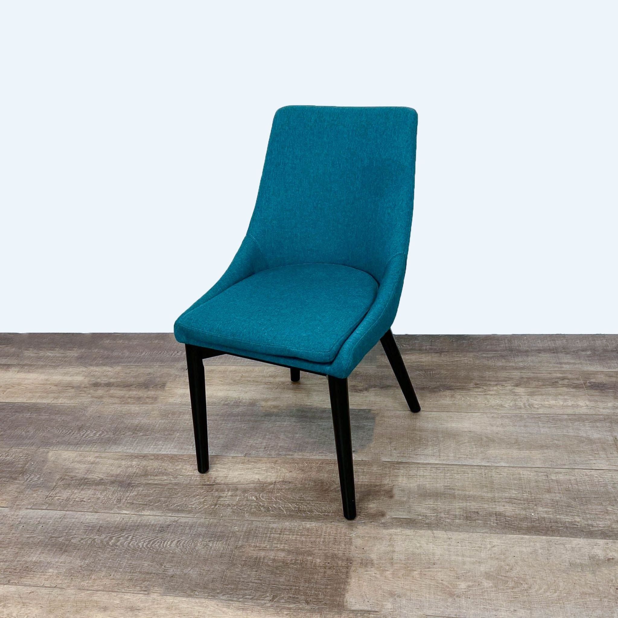 The contemporary modern dining chair by comes densely padded in foam, finely upholstered in polyester fabric, and supported by tapered wood legs coated black.