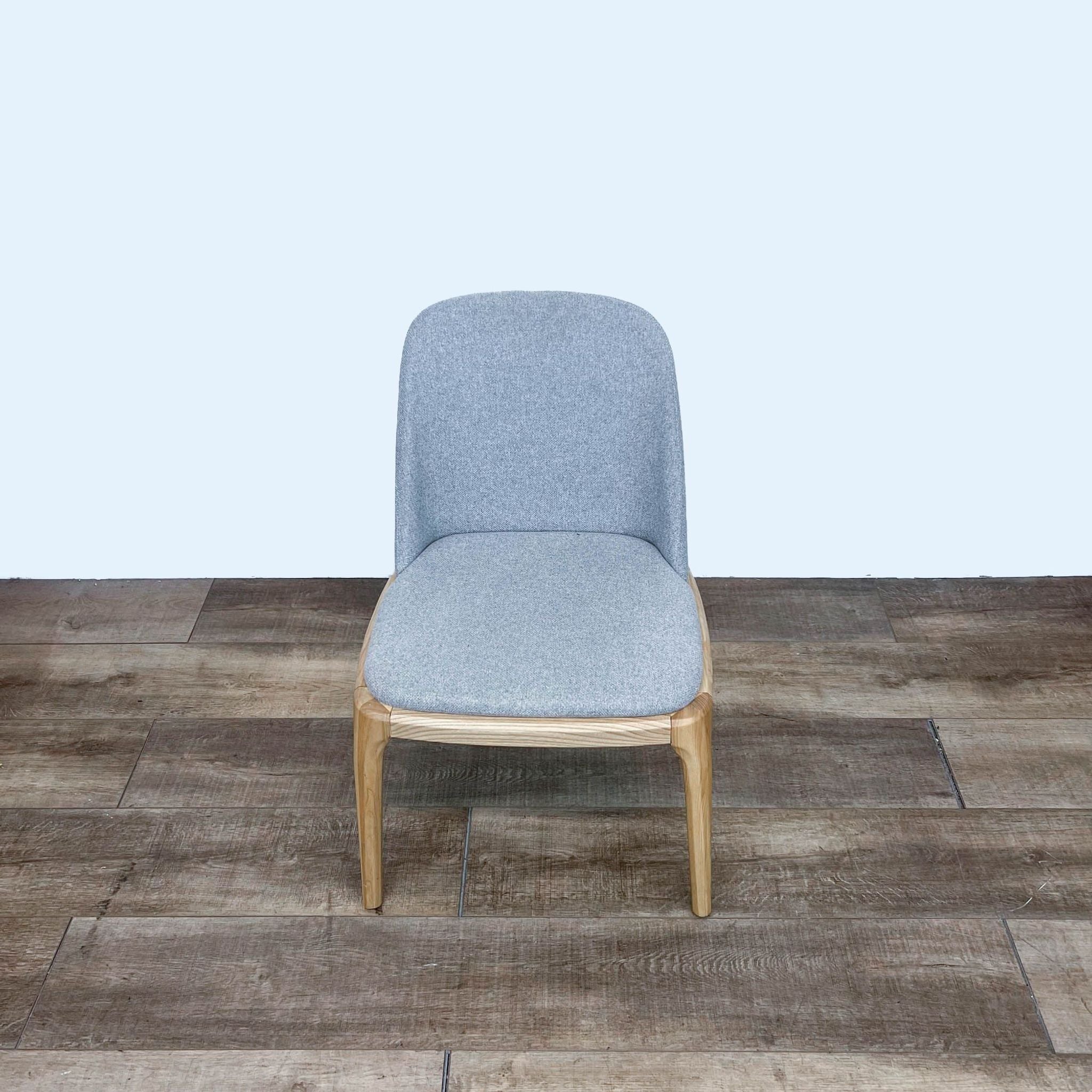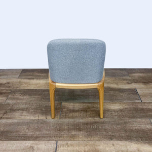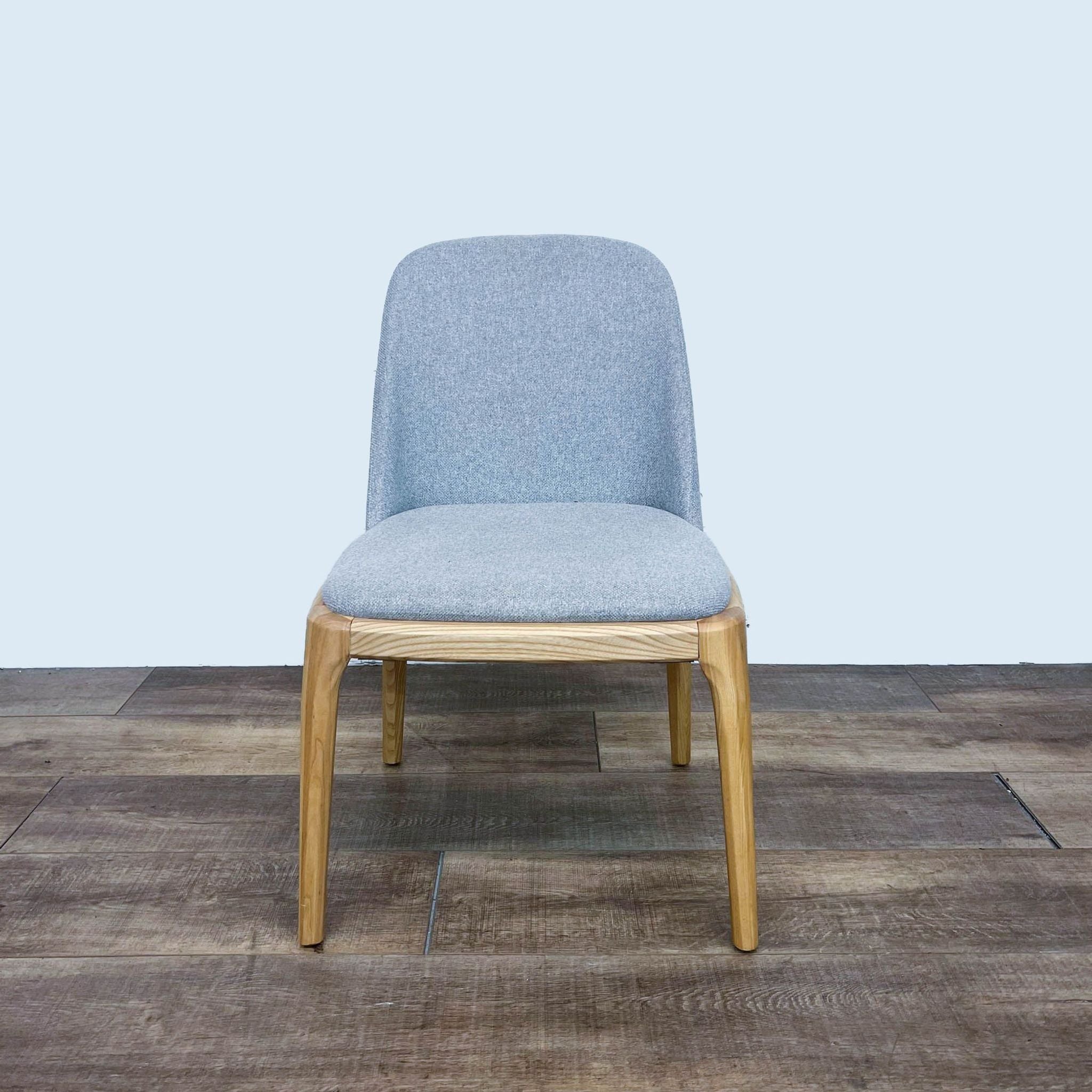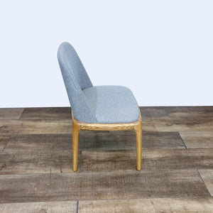 This transitional dining chair features a wood frame finished in a light honey with slightly splayed solid wood legs that support a shapely upholstered seat of high-performance fabric.