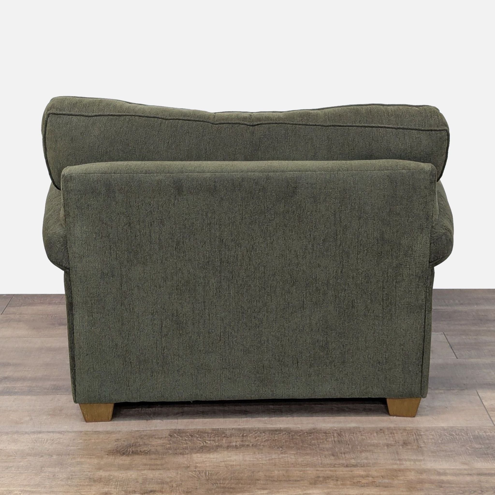 Oversized lounge chair with rolled arm style, tapered wood feet and plush cushions.