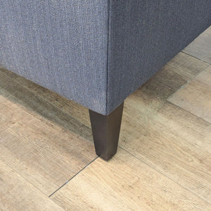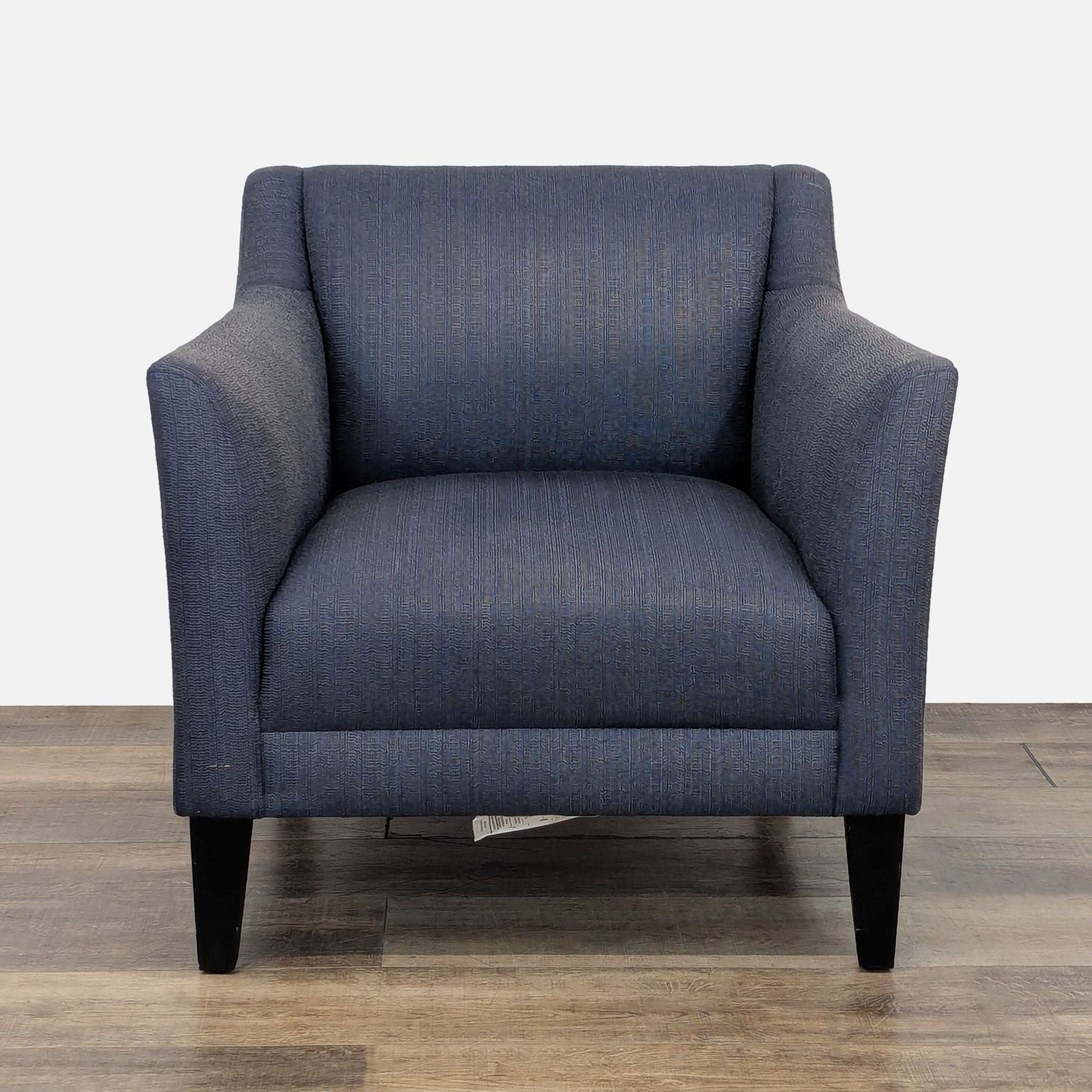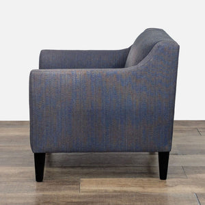 Features high track arms with a distinct cutaway and modern tapered legs with tight back cushion and seat upholstered in a synthetic, fashion-statement fabric.