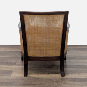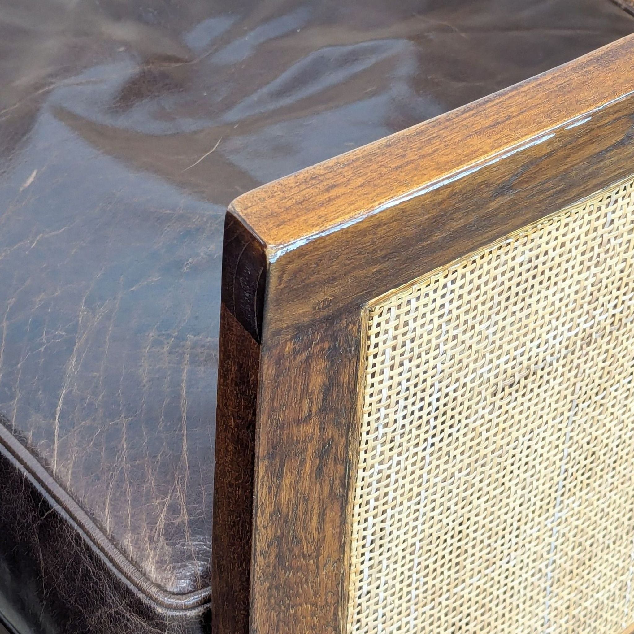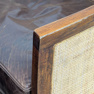 Crafted of teak and handwoven rattan panels, the chair hosts a deep, thick cushion upholstered in full-aniline leather finished with a beautiful, aged patina.
