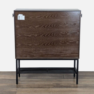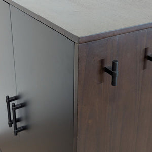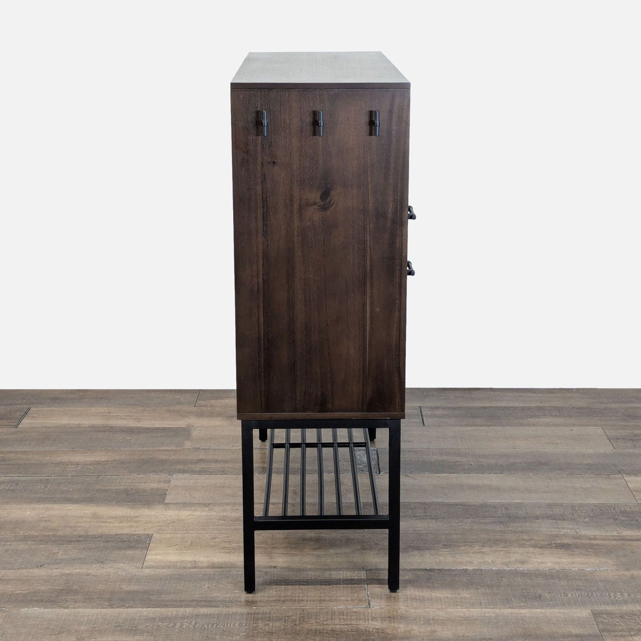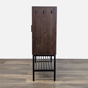 Cabinet offers two cubbies, two drawers, and two double doors that open to two shelves. Includes three removable hooks on each side. Made of beautifully grained acacia wood, the two-toned cabinet is stained warm brown with a black finish on the doors and drawer fronts.