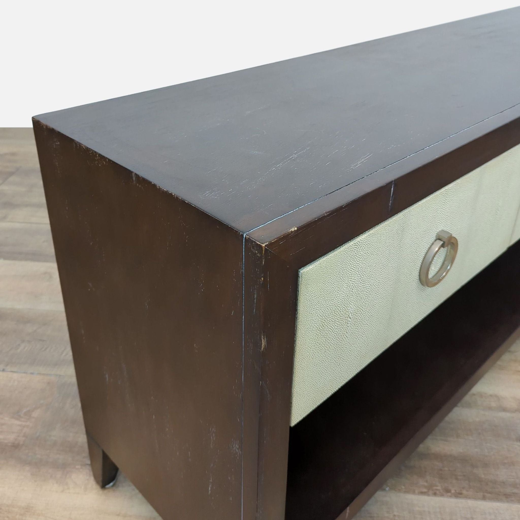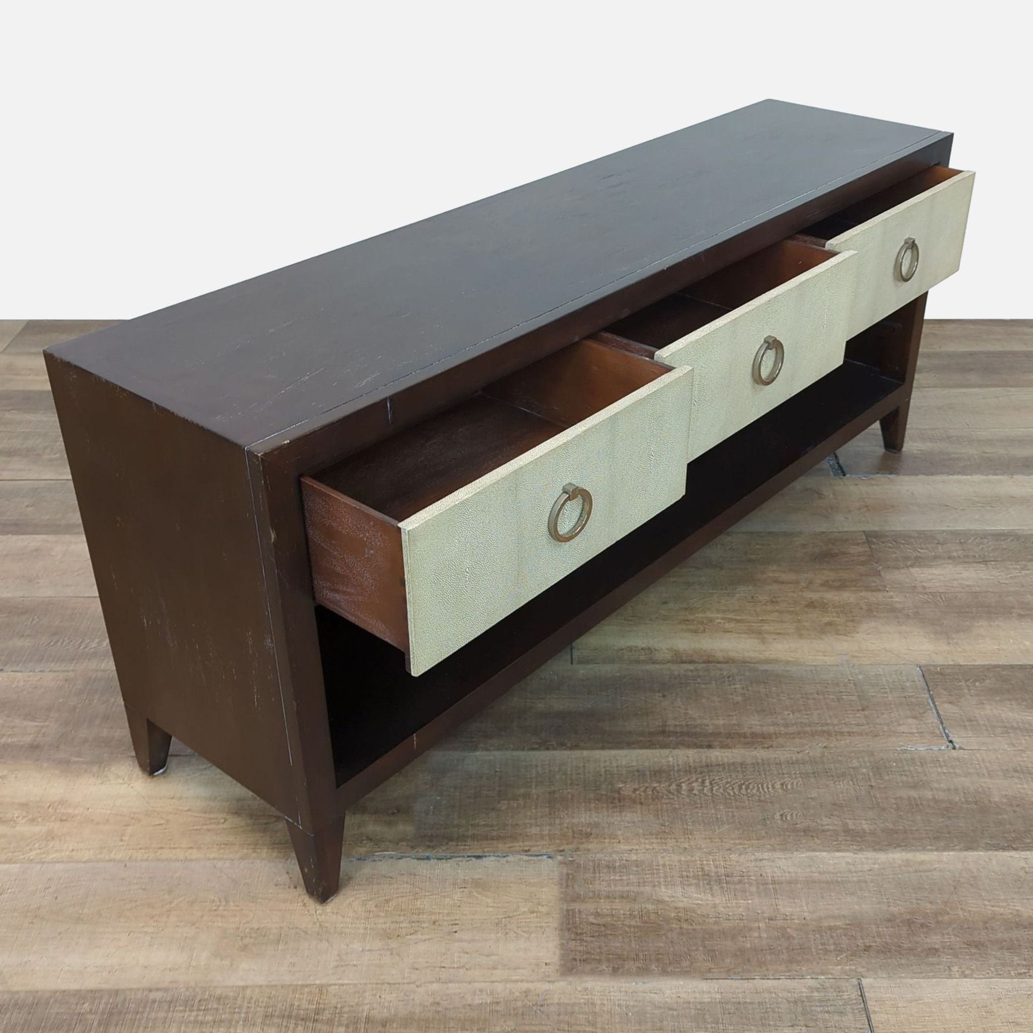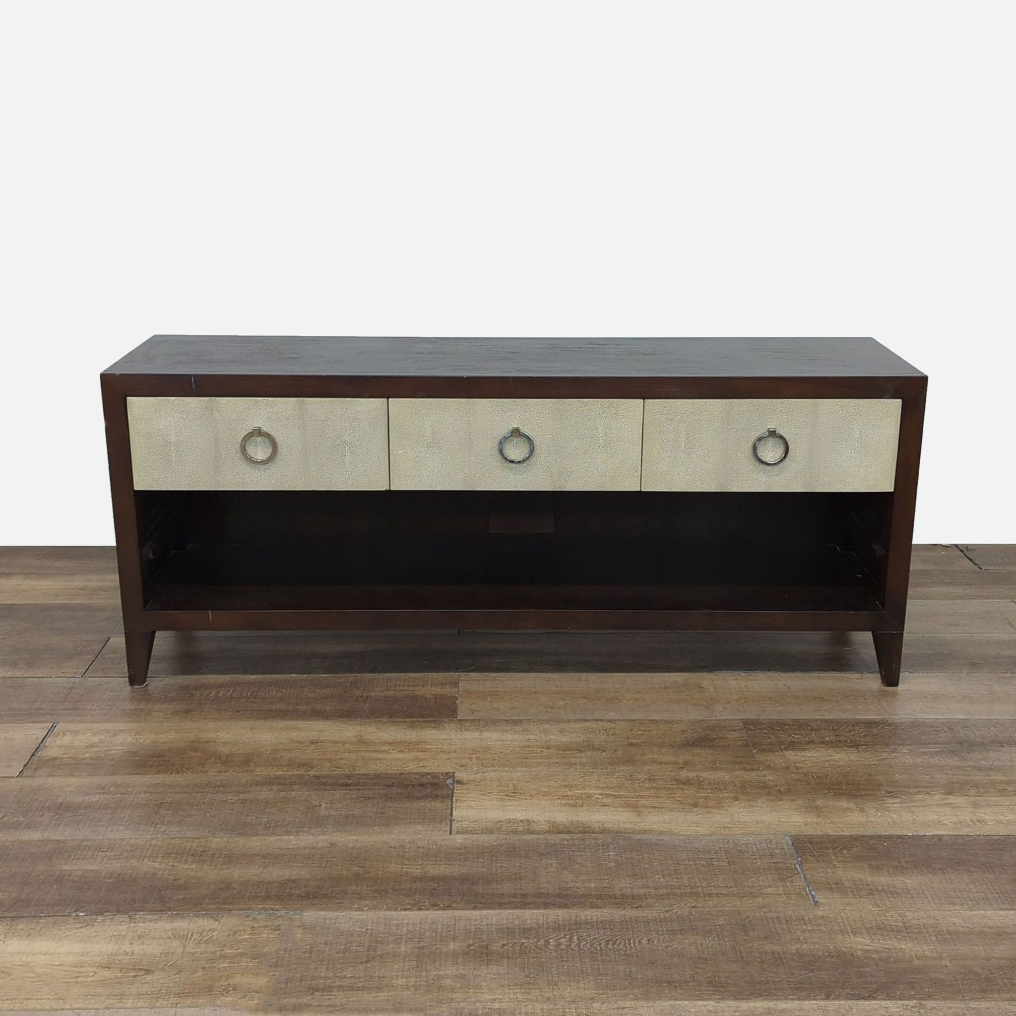 Shagreen covered drawers in wood frame with metal hardware. Note: the bottom shelf of the credenza is missing.